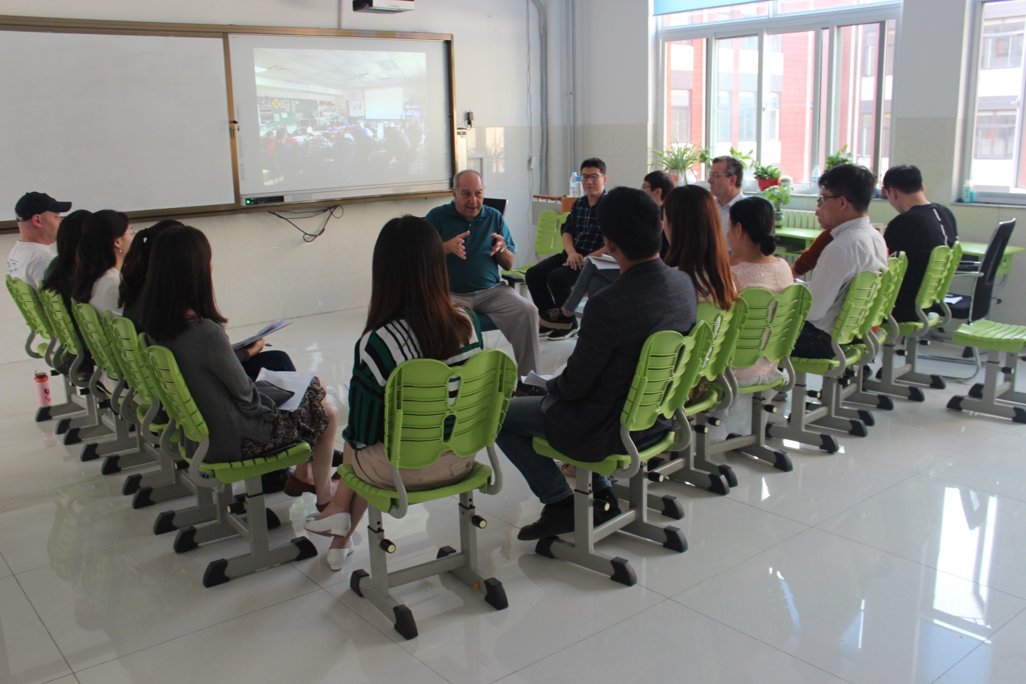 9月17日 Dr. Cammer為濟南托馬斯教師們組織的首個研討會就開門見山題為“The New Teaching Methodology” (新型教學方法)。他鼓勵濟南的各位教師采用美國托馬斯·杰弗遜科技高中相同的教學模式,以提高濟南托馬斯實驗學校在國際上的競爭力。 Dr. Cammer指出,教學要以學生為中心,課上的時間非常寶貴,不能夠浪費課上的時間去講解學生課下可以自行獲得的知識。在教學過程中,老師應該逐漸培養學生強大的自學能力,并對自學結果及時跟進評定。各學科老師應該共同努力,將學生培養成為具備終身學習能力的人。在課上,教師要走出既定的思維模式和讓自己感覺安全的知識領域,勇于提問開放式的、甚至是沒有答案的問題,激發學生的思考。