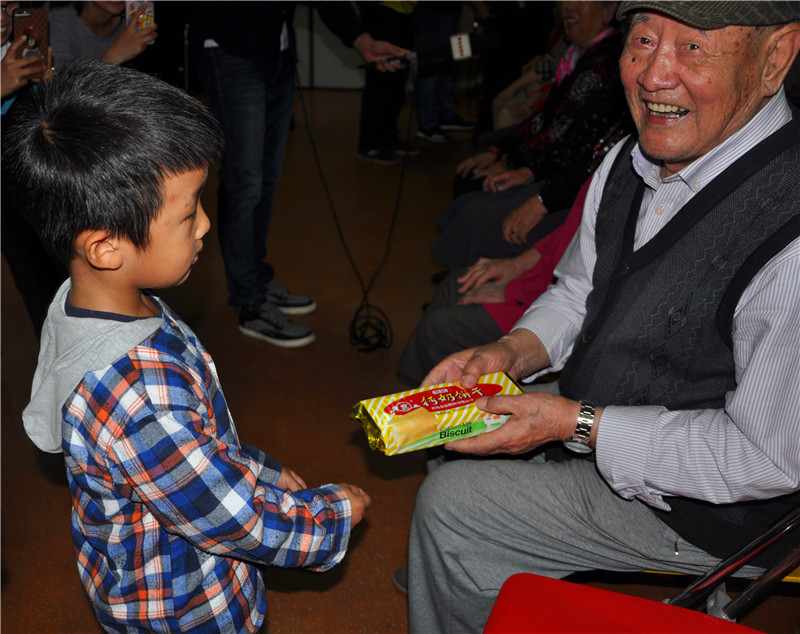 小朋友們代表青島福彩為老人送上重陽節禮物