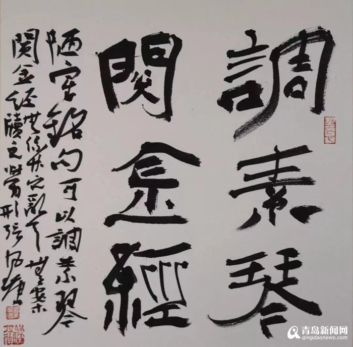 書法小斗方《調素琴閱金經》,以篆隸筆法為主,古拙樸茂,風神皆備。
