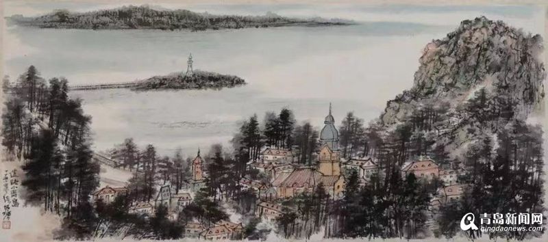 山水橫批《青島攬勝》,高22厘米,寬48厘米,僅有一尺見方的卷幅,將匯泉灣、太平山、老城區、五四廣場等青島元素盡攬其中,以小見大、氣象萬千。