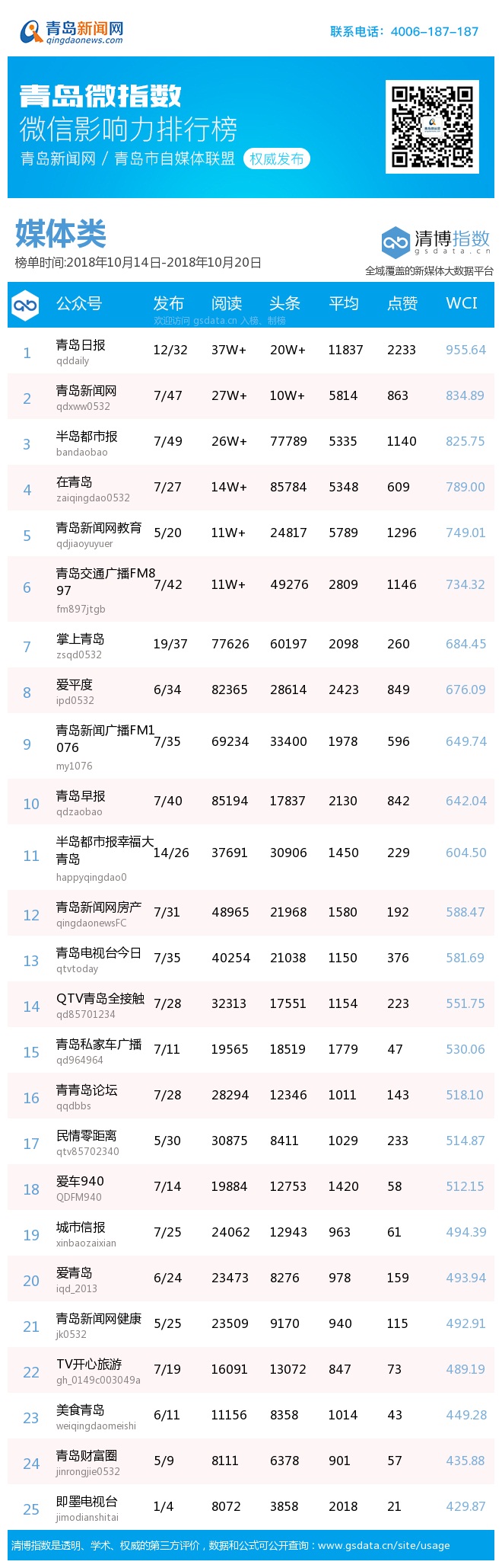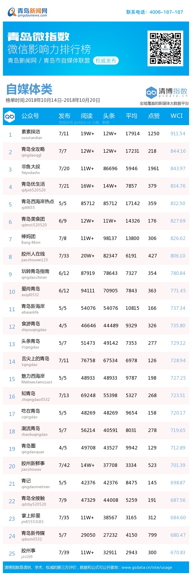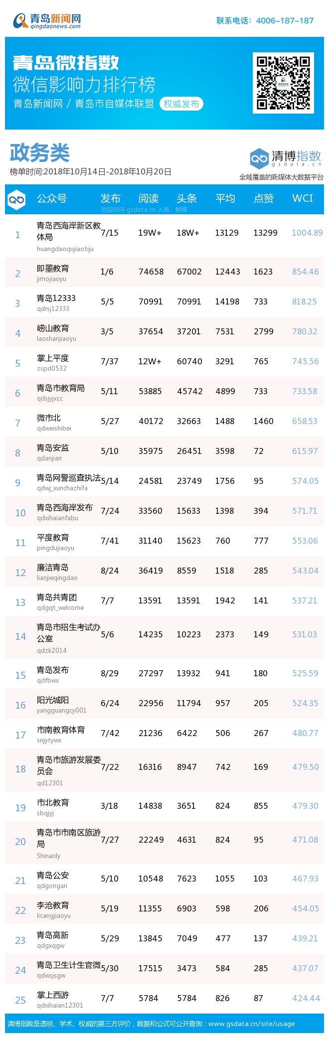 青島新聞網10月22日訊(記者 邢書玲)由青島新聞網、清博指數平臺聯手打造的“青島微指數微信影響力排行榜”今日發布一周(10月14日-10月20日)榜單。