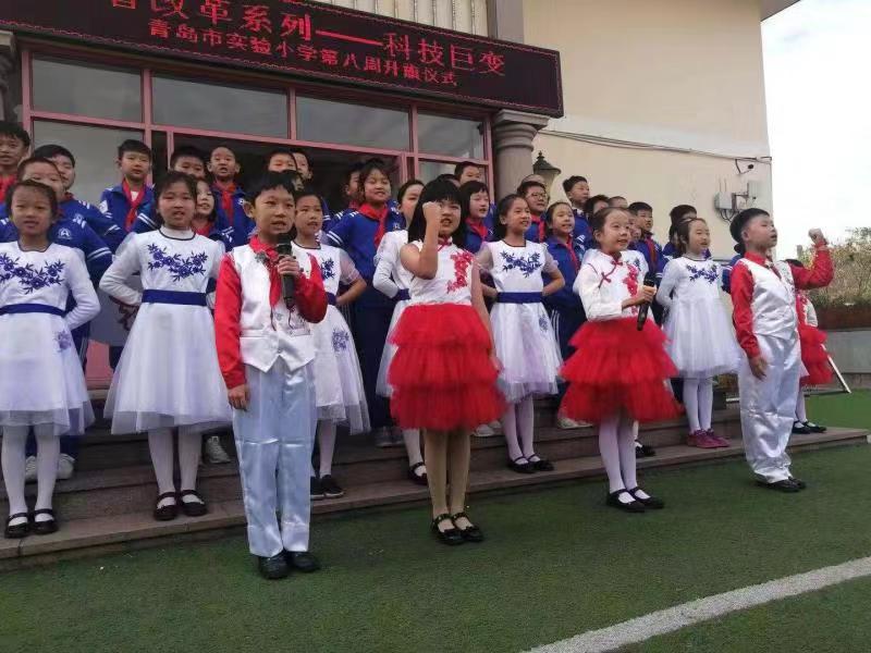 周一,青島市實(shí)驗(yàn)小學(xué)三年級(jí)一班的同學(xué)們?cè)趯W(xué)校升旗儀式上,朗誦改革開(kāi)放40年科技變化的兒童詩(shī)歌。