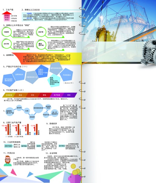 市統計局發布數據顯示,1978年以來,青島工業增長迅速,工業產出總值分別在1985年、1996年、2010年突破“百億”“千億”和“萬億”大關。如今,工業總產值是當時的300多倍。近年來,青島連續入圍全國工業穩增長和轉型升級成效明顯的城市,全市規模以上工業增加值保持7.5%的中高速增長,工業質效提升。2017年全市規上工業企業實現利潤705.1億元,平均主營業務收入利潤率達到10.0%,工業穩增長和轉型升級成效顯著;規上裝備制造業增加值比重達到45.8%,高技術制造業和戰略性新興產業工業增加值比重分別為8.5%和21.5%,工業高新技術產業產值比重(42.5%)高于全省7.5個百分點,新舊動能轉換積極推進。