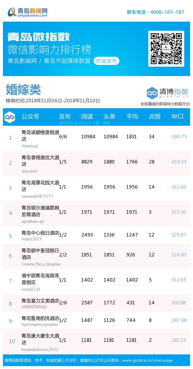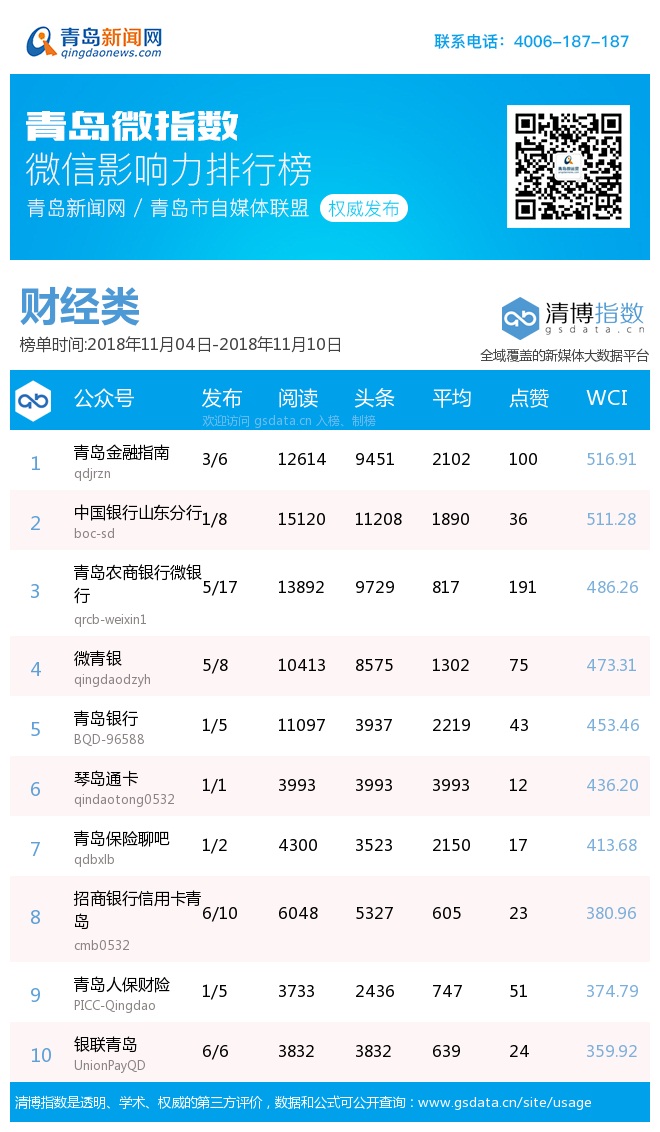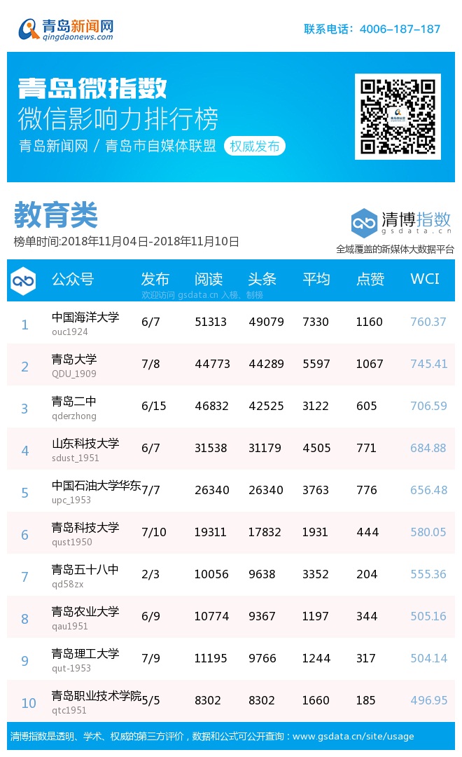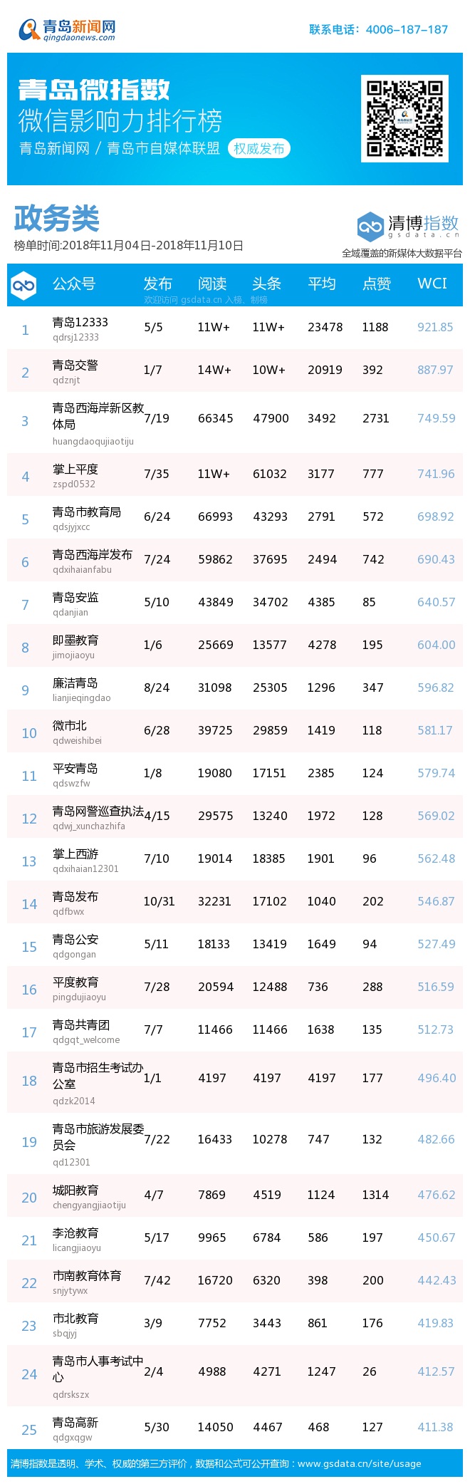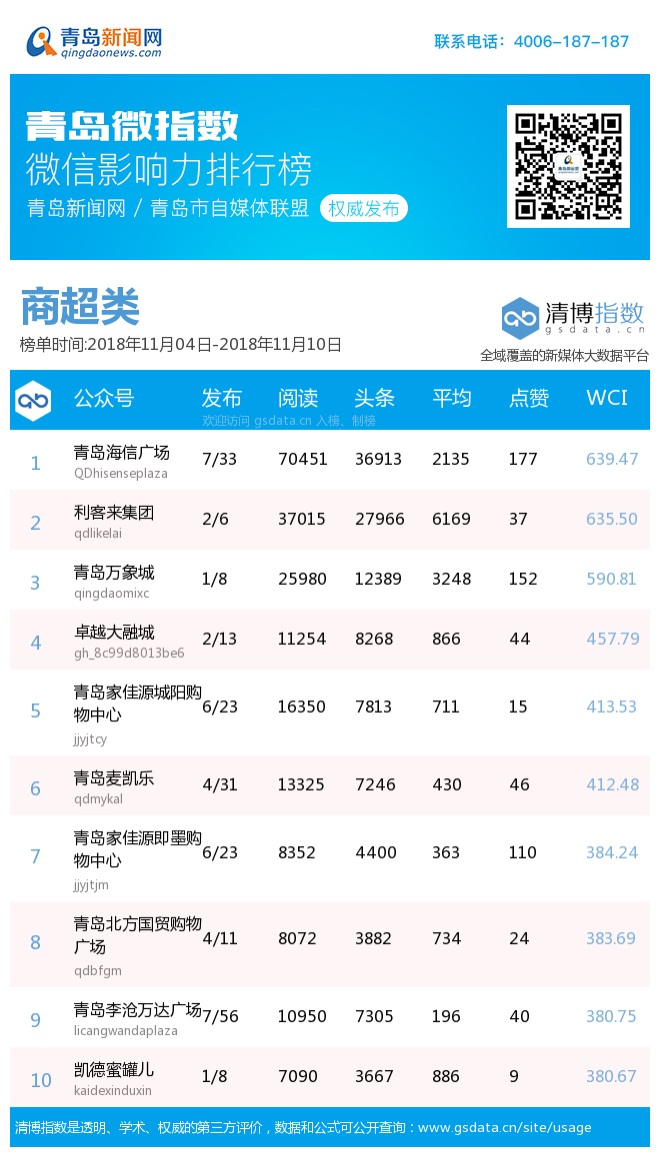 青島新聞網11月12日訊(記者 邢書玲)由青島新聞網、清博指數平臺聯手打造的“青島微指數微信影響力排行榜”今日發布一周(11月4日-11月10日)榜單。