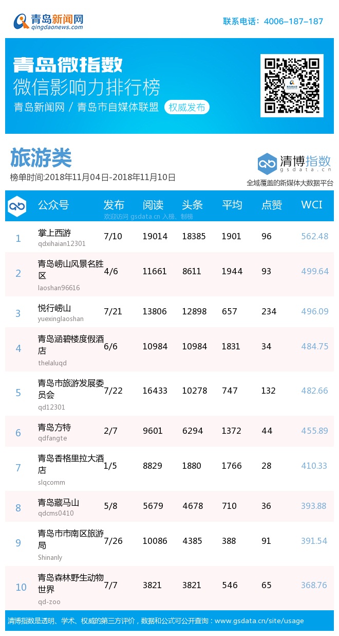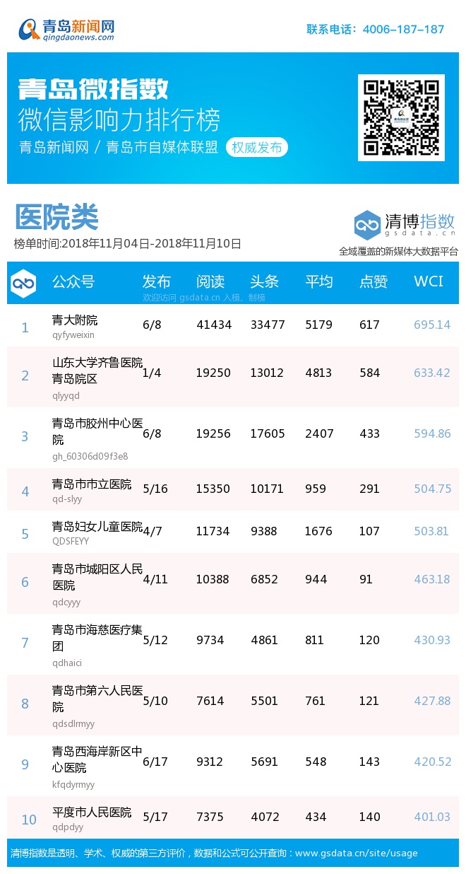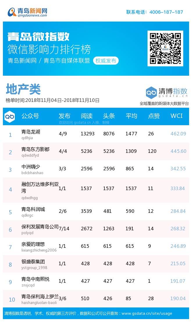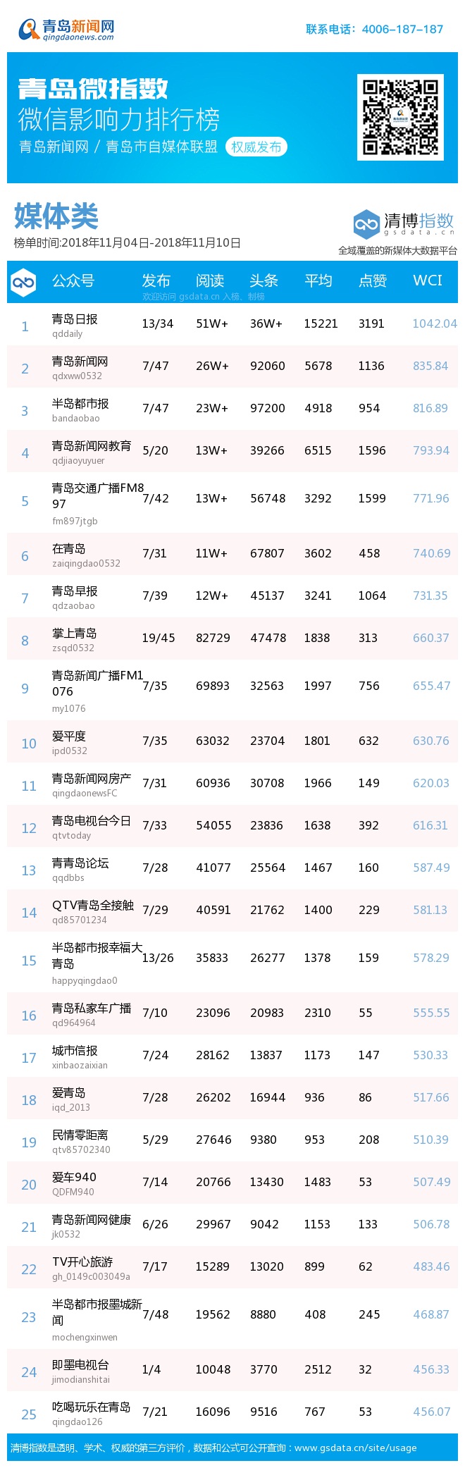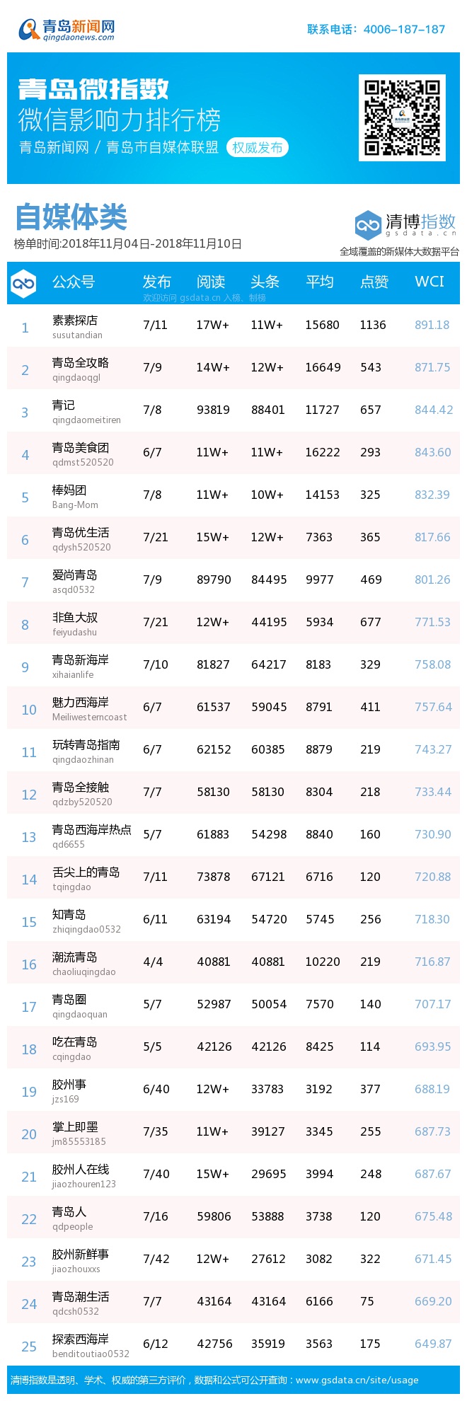 青島新聞網11月12日訊(記者 邢書玲)由青島新聞網、清博指數平臺聯手打造的“青島微指數微信影響力排行榜”今日發布一周(11月4日-11月10日)榜單。