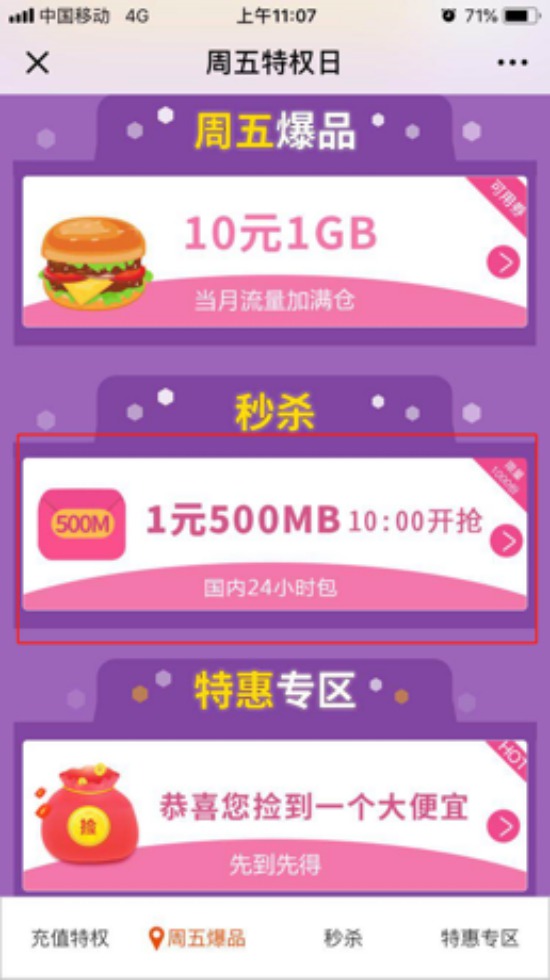 第五步:每周五10:00,還可參與1元搶購(gòu)500MB24小時(shí)包活動(dòng),搶購(gòu)份數(shù)以當(dāng)前頁(yè)面為準(zhǔn),搶完為止。