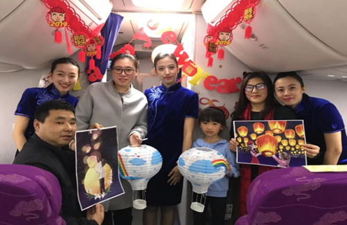 熱鬧的登機音樂配合著乘務員們喜慶的紅旗袍,一聲聲“新年好,歡迎乘機!”瞬間讓旅客們被濃厚的新年氛圍所包圍??团摾飸覓斓男〖t燈籠和氣球拉花,乘務員臉上綻放著溫暖甜美的笑容,無一不在渲染著新年的新氣象,2019年1月1日SC4781青島-重慶新年送祝福之旅由此開啟。