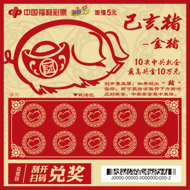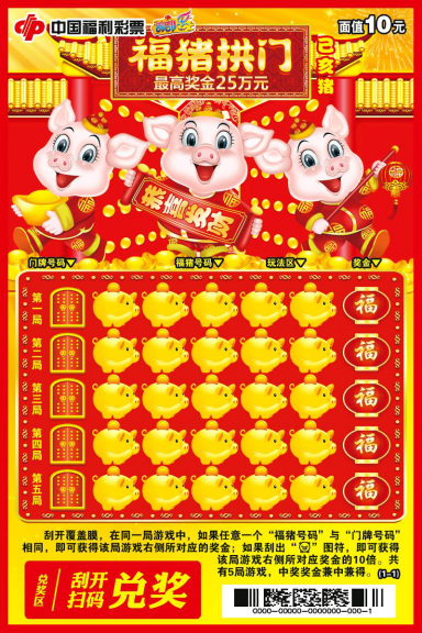 “己亥豬-福豬拱門”是為慶祝己亥豬年而推出的一款生肖紀念票。該款彩票取材于中國傳統(tǒng)生肖文化,畫面中形體飽滿、憨厚可愛的三只福豬造型生動、熱鬧喜慶。彩票再以玩法區(qū)進行總體布局,烘托出紅火、歡快的節(jié)日氛圍,寓意福豬送福運。彩票采用“數(shù)字比對+特殊圖符”玩法,簡單好玩。