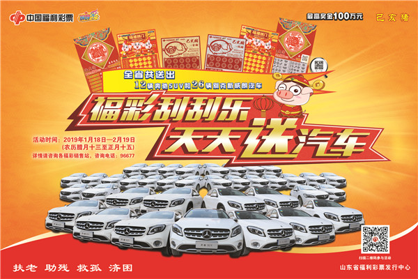 2019年1月18日—2月19日(農(nóng)歷臘月十三至正月十五),在山東省內(nèi)購買福彩刮刮樂“己亥豬”5元、10元、20元彩票任意品種,用手機掃描玩法區(qū)內(nèi)的二維碼參與抽獎活動,就有機會獲得奔馳SUV或別克新威朗汽車。