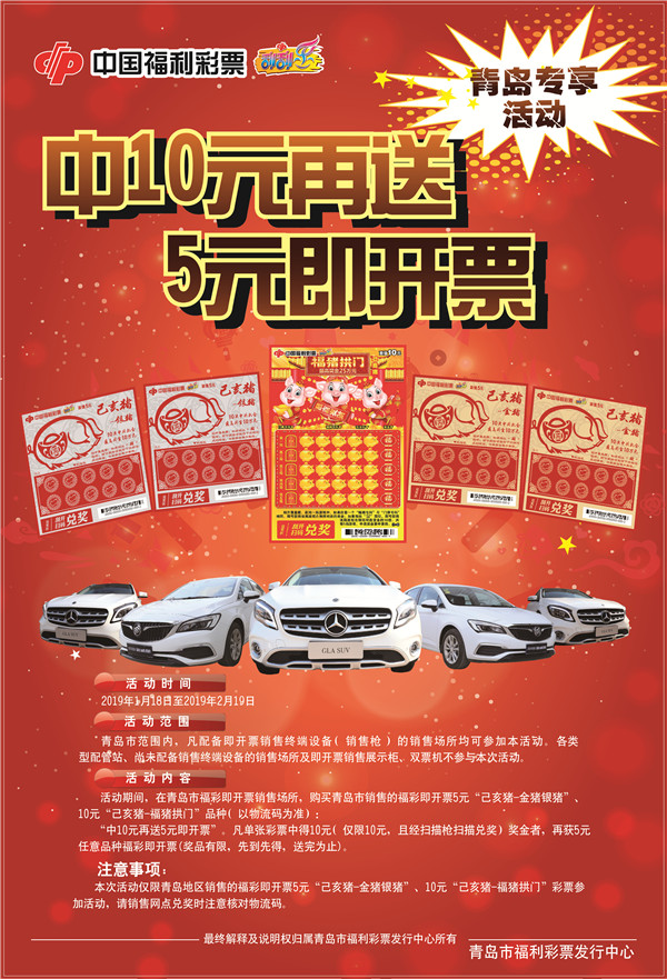 2019年1月18日—2月19日,在青島市范圍內(nèi)配備即開票銷售終端設(shè)備(銷售槍)的銷售場所購買青島市銷售的福彩即開票5元“己亥豬-金豬銀豬”、10元“己亥豬-福豬拱門”品種(以物流碼為準):“中10元再送5元即開票”。凡單張彩票中得10元(僅限10元,且經(jīng)掃描槍掃描兌獎)獎金者,再獲5元任意品種福彩即開票(獎品有限,先到先得,送完為止)。