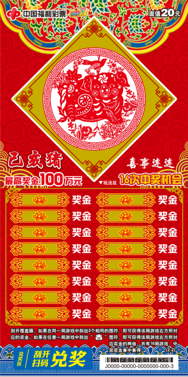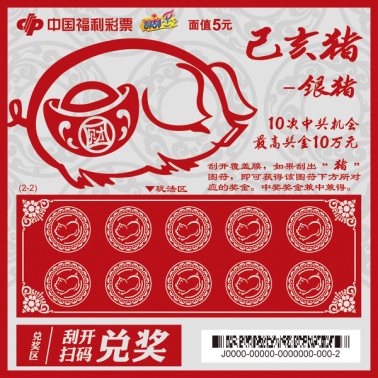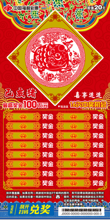 “己亥豬-喜事連連”是為慶祝己亥豬年而推出的一款生肖紀念票。該款彩票使用飽和度極高的大紅油墨與金色油墨印刷,點綴豐富的彩色紋飾,給人帶來強烈的視覺沖擊。以剪紙為主題,票面中小豬與喜鵲嬉戲,喻意“豬年喜事連連”,充滿濃郁的祝福之感。彩票采用多局三同圖玩法,頭獎高達100萬元。
