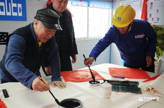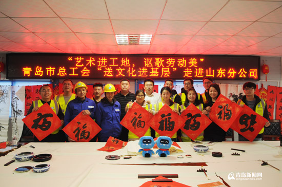 青島新聞網1月24日訊(記者 張力偉 通訊員 孫靜 王彥玲)23日,中建三局總承包公司山東分公司聯合青島市總工會開展“送文化進基層”書畫書筆會交流活動,來自青島市書法協會的6位書畫家來到中建三局中船重工海洋裝備研究院項目與農民工工友齊聚,以書畫寄情懷,謳歌勞動美。