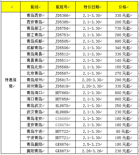 1月29日,從海南航空商委青島營業(yè)部獲悉,為了滿足春運(yùn)大量旅客的出行需求。海南航空商委聯(lián)合旗下航空公司海南航空、首都航空、天津航空、祥鵬航空、北部灣航空近期在青島=西安、麗江、成都、南昌、海口、北京、武漢、鄭州、淮安、寧波、襄陽等多條航線推出特價機(jī)票,部分特價機(jī)票為1至3折。