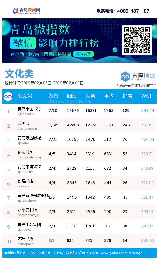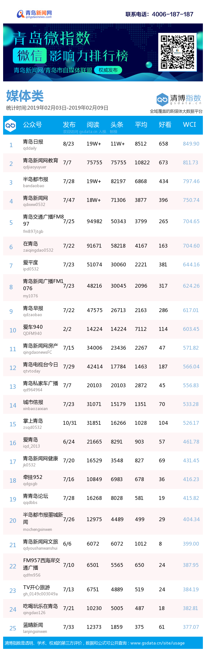 青島新聞網2月11日訊(記者 邢書玲)由青島新聞網、清博指數平臺聯手打造的“青島微指數微信影響力排行榜”今日發布一周(2月3日-2月9日)榜單。