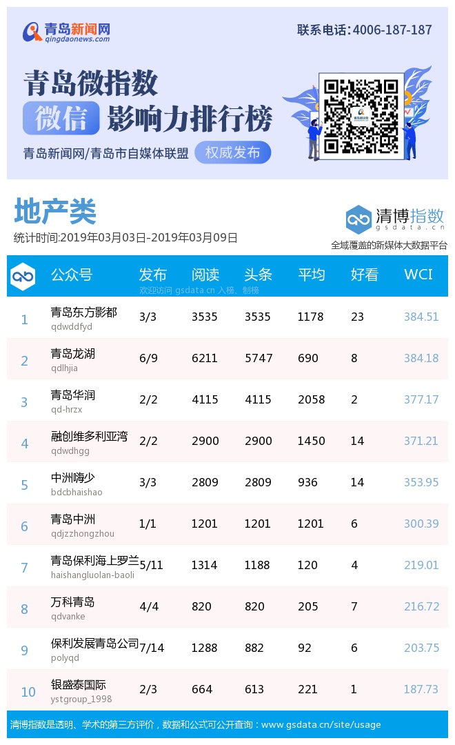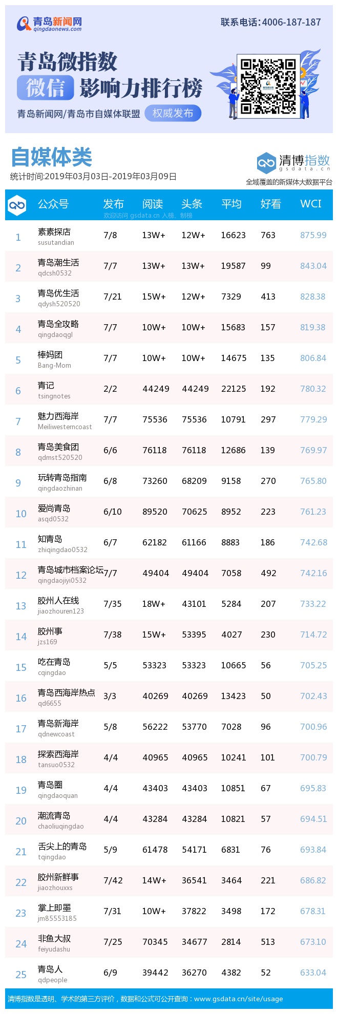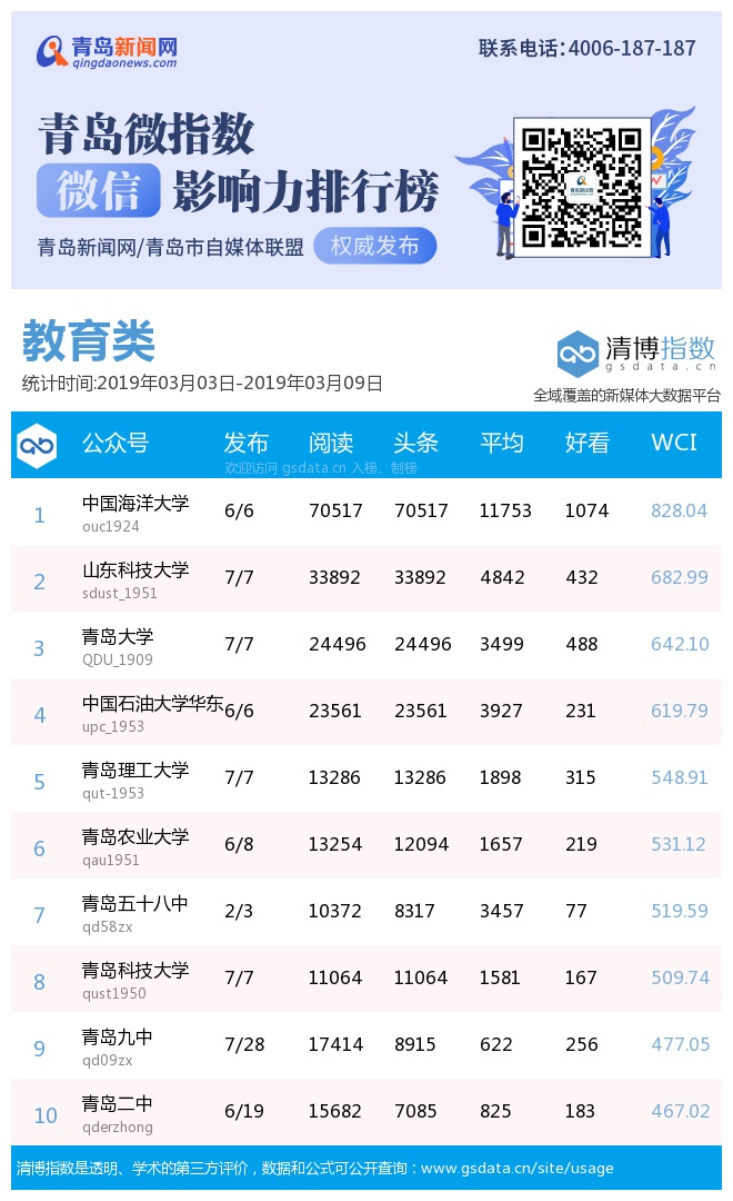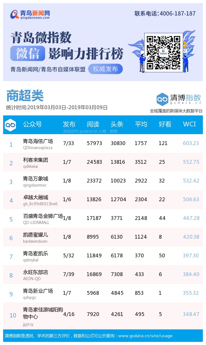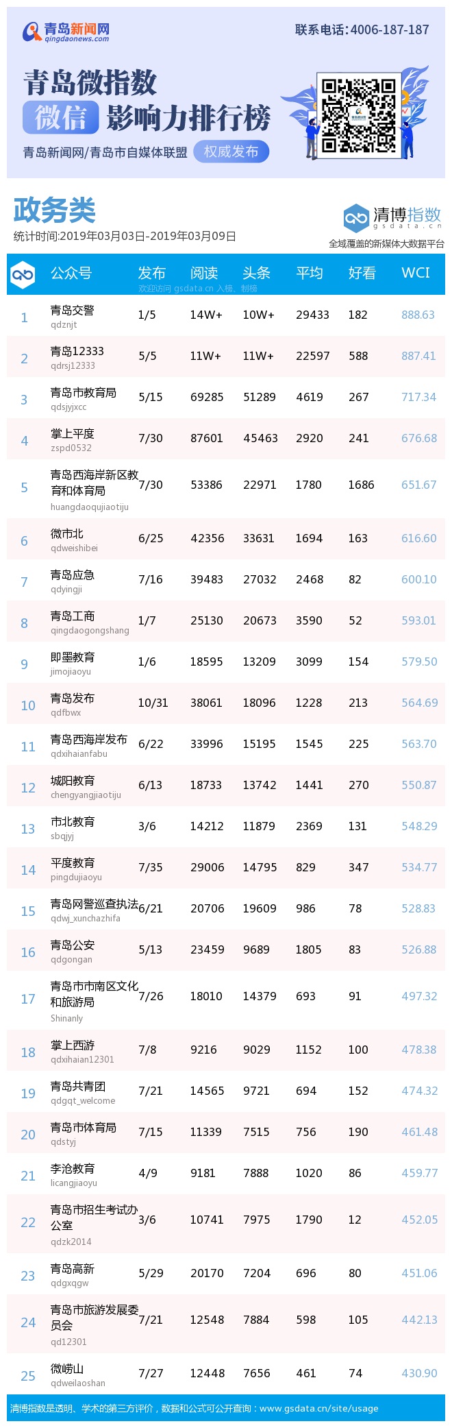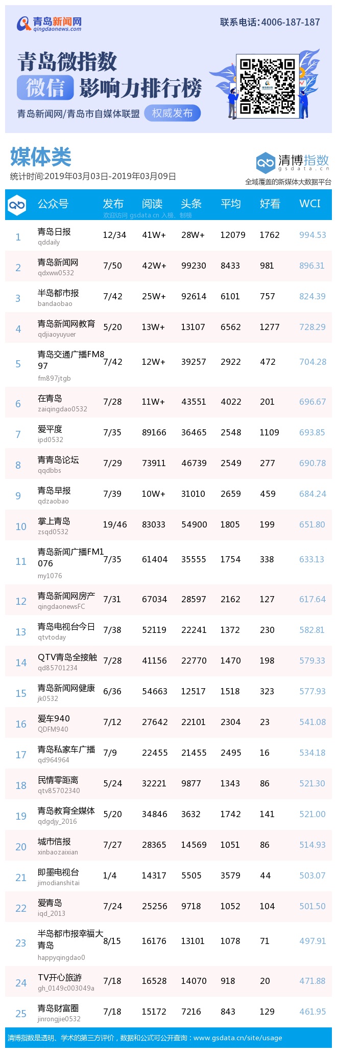 青島新聞網3月11日訊(記者 邢書玲)由青島新聞網、清博指數平臺聯手打造的“青島微指數微信影響力排行榜”今日發布一周(3月3日-3月9日)榜單。