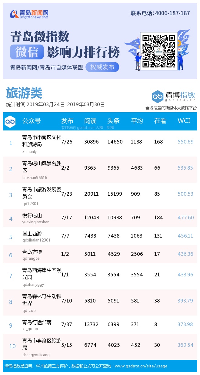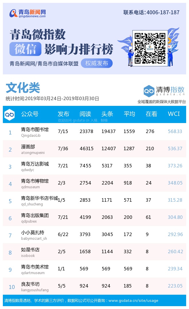 青島新聞網4月2日訊(記者 邢書玲)由青島新聞網、清博指數平臺聯手打造的“青島微指數微信影響力排行榜”今日發布一周(3月24日-3月30日)榜單。