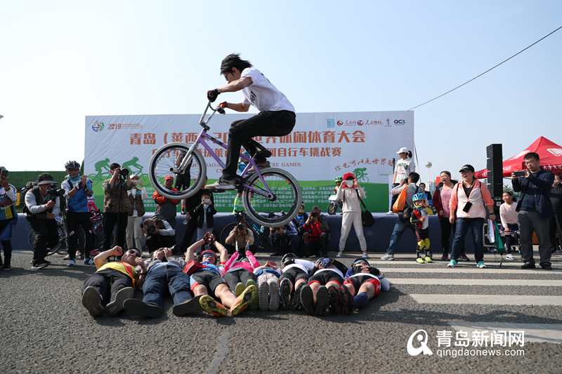 小輪車(chē)飛躍人墻表演。 (張代志 攝)