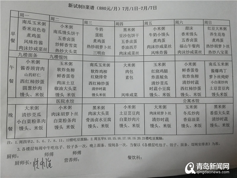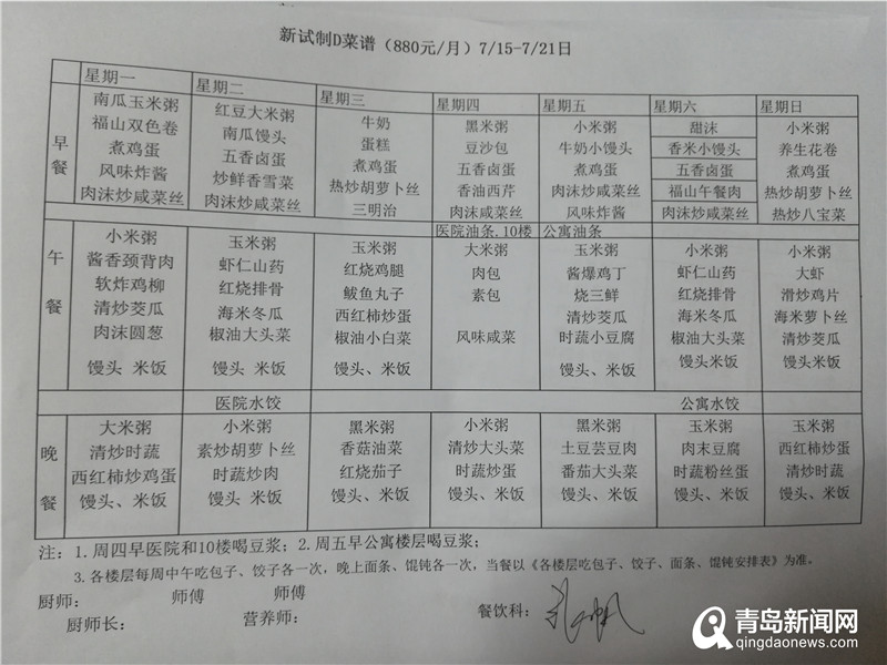 福山老年公寓王院長(zhǎng)告訴記者,收到這一信息后公寓內(nèi)部十分重視,對(duì)帖子中提到的問(wèn)題進(jìn)行核查。首先是飲食質(zhì)量問(wèn)題,帖子中提到的“餃子里有骨頭渣”、“燉肉變質(zhì)有異味”、“玉米碴子飯、麥粒飯”的情況不存在。關(guān)于每天食譜的制定,王院長(zhǎng)表示,養(yǎng)老院與中食安心食品管理有限公司合作,根據(jù)老年人所需營(yíng)養(yǎng)配比和時(shí)令蔬菜制定,做到蛋白質(zhì)、脂肪、碳水化合物配比合理。