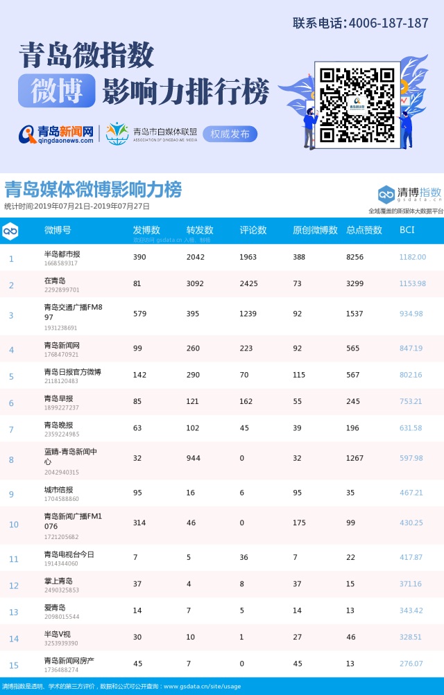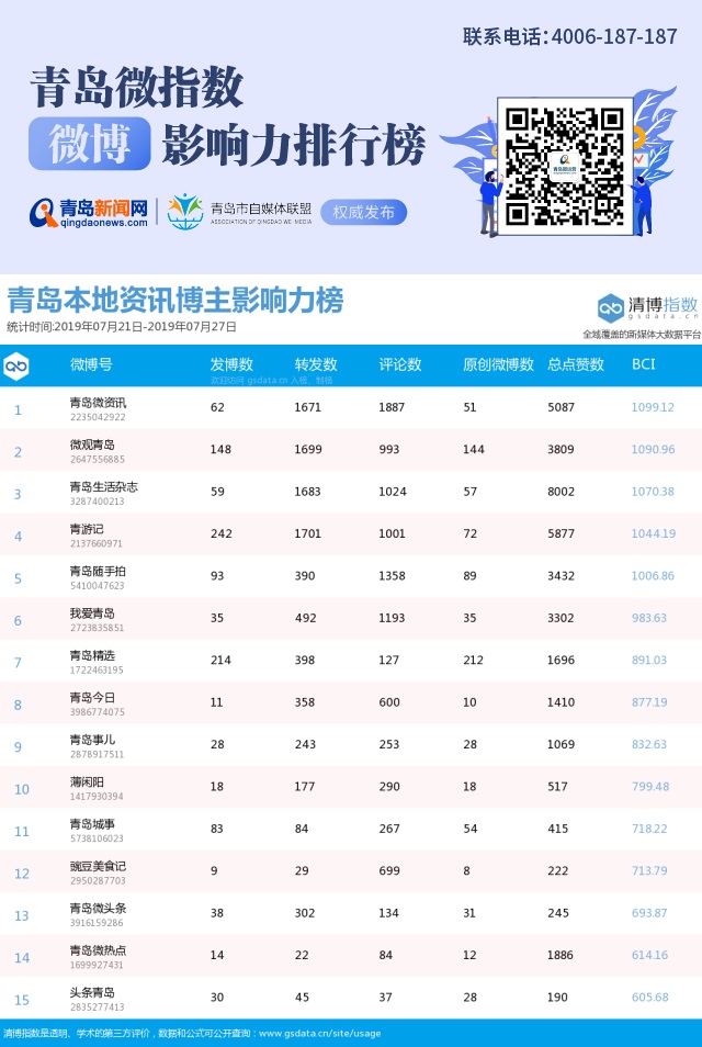 青島新聞網(wǎng)7月29日訊(記者 邢書(shū)玲)由青島新聞網(wǎng)、清博指數(shù)平臺(tái)聯(lián)手打造的“青島微指數(shù)微博影響力排行榜”今日發(fā)布一周(7月21日-7月27日)榜單。