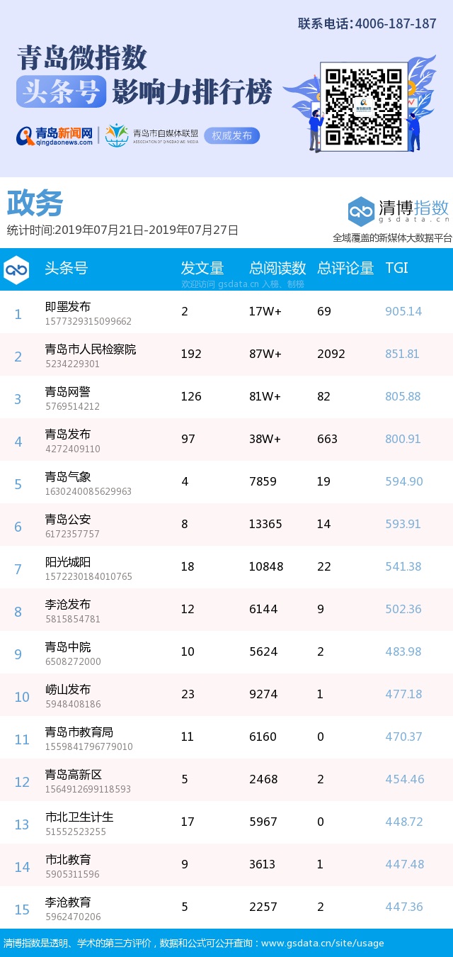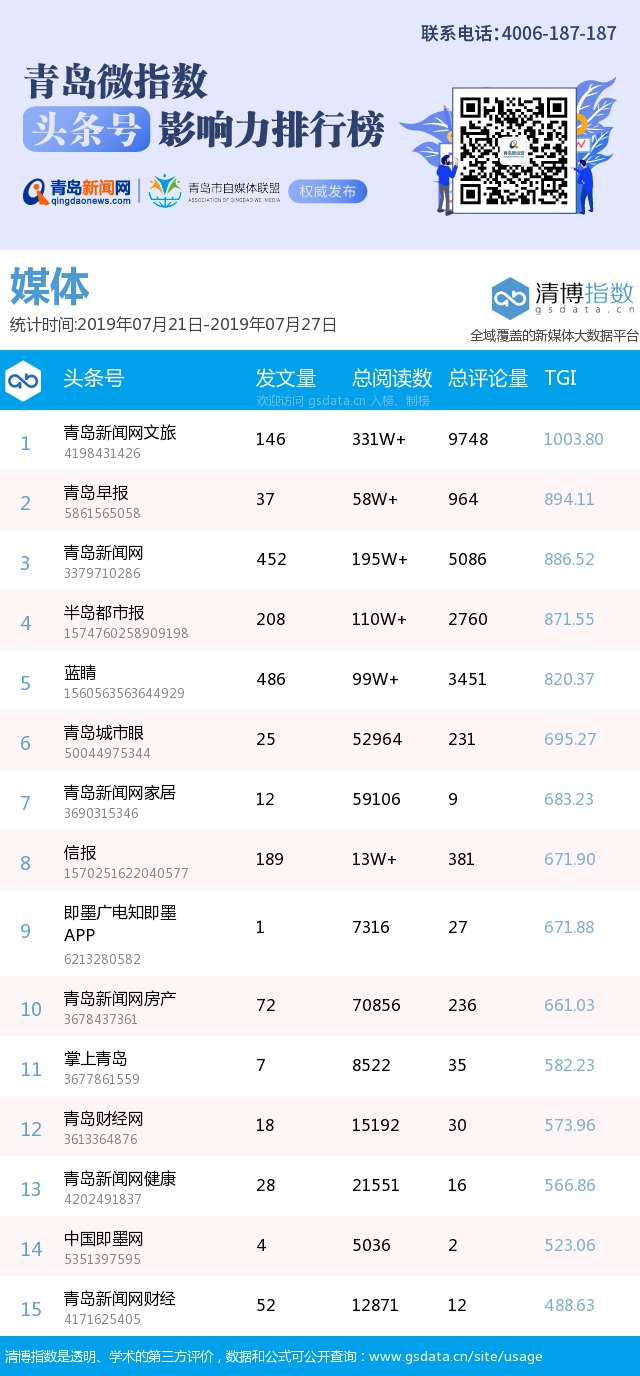 青島新聞網(wǎng)7月29日訊(記者 邢書玲)由青島新聞網(wǎng)、清博指數(shù)平臺(tái)聯(lián)手打造的“青島微指數(shù)頭條號(hào)影響力排行榜”今日發(fā)布一周(7月21日-7月27日)榜單。