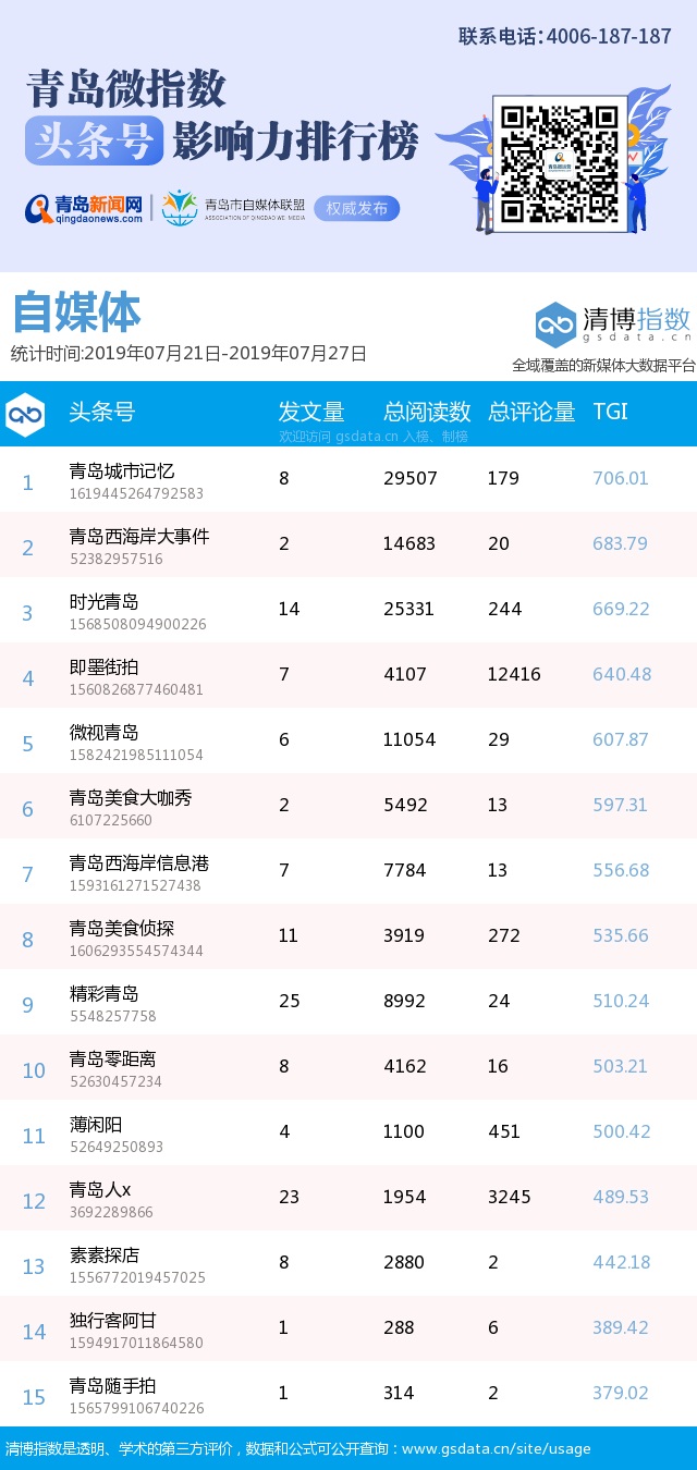自媒體類頭條號(hào)影響力排行榜中,“青澀島嶼”發(fā)布的“青島金沙灘啤酒城正式開城!,現(xiàn)場(chǎng)上萬(wàn)名游客蜂擁而入”以播放量1.5萬(wàn)+,評(píng)論106的成績(jī)占據(jù)榜首。