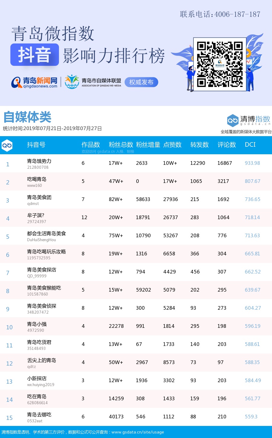 青島新聞網7月29日訊(記者 邢書玲)由青島新聞網、清博指數平臺聯手打造的“青島微指數抖音影響力排行榜”今日發布一周(7月21日-7月27日)榜單。