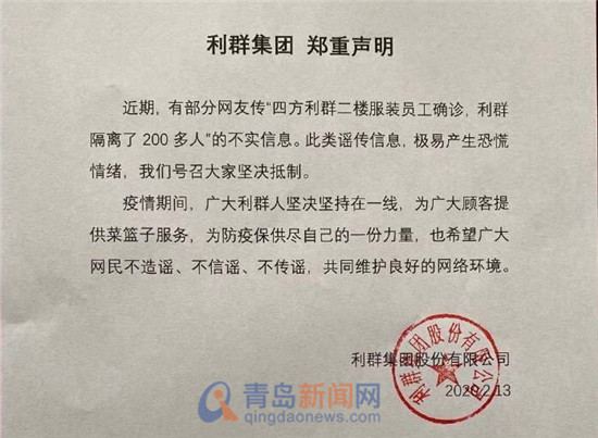 青島新聞網2月13日訊(記者 丁淑華)近期,有部分網友傳播“四方利群二樓服裝員工確診,利群隔離了200多人”。今日,利群集團官方進行辟謠,此消息不屬實,并表示,疫情期間廣大利群人堅決堅持在一線,為顧客提供菜籃子服務,為防疫保供盡自己的一份力量。青島網警再次提醒廣大網民:值此防控疫情的關鍵階段,望廣大網民眾志成城,共克時艱,切勿盲目轉發未經核實的疫情信息,不造謠、不信謠、不傳謠,共同維護良好的網絡環境。