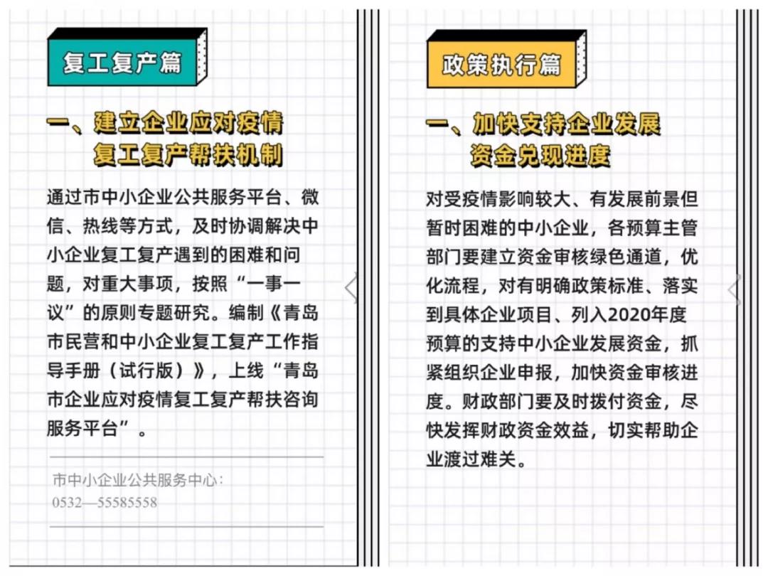 青島新聞網(wǎng) 2月14日訊 以青島市惠企18條政策為發(fā)端,面對(duì)疫情沖擊,青島快速行動(dòng),一系列新政策、新方案不斷細(xì)化,形成了“18+N”的政策體系,幫扶企業(yè)復(fù)工復(fù)產(chǎn),保生產(chǎn)穩(wěn)經(jīng)營。政策涵蓋用工、稅收、房租、金融等領(lǐng)域,并附相關(guān)部門聯(lián)系方式,“一冊(cè)在手”方便企業(yè)及時(shí)獲取信息。
