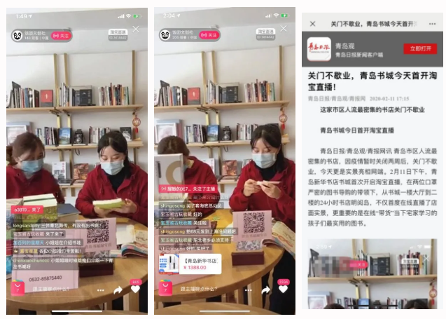 除去值班人員需要嚴格的消毒與體溫管理外,青島書城下屬4家線上店鋪,分別在天貓(2家)、淘寶和京東。現階段為滿足假期及開學季前讀者的剛需,上架品種以教材教輔、假期推薦閱讀書目為主,少兒讀物、社科文藝為輔。書城暫停營業期間,廣泛宣傳線上服務方式。2020年2月5日,青島書城與市南文旅局、愛情島聯合推出“相信閱讀的力量”書單,進一步擴大覆蓋面。2020年2月11日,青島書城進行首次淘寶直播帶貨,青島日報對此次直播進行報道,向市民宣傳暫停營業期間可以選擇到書城線上選書。