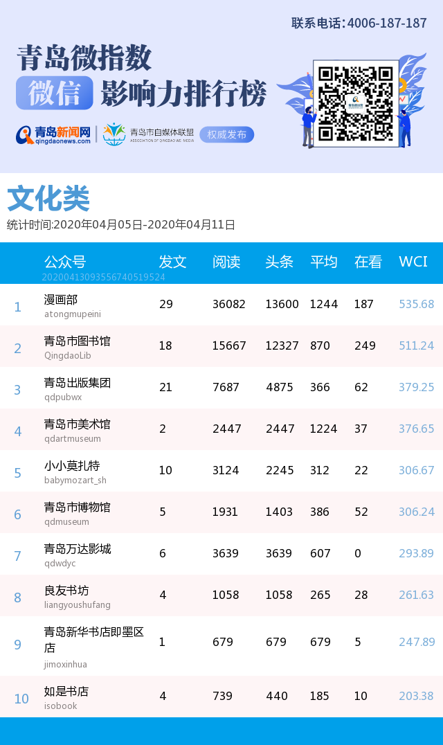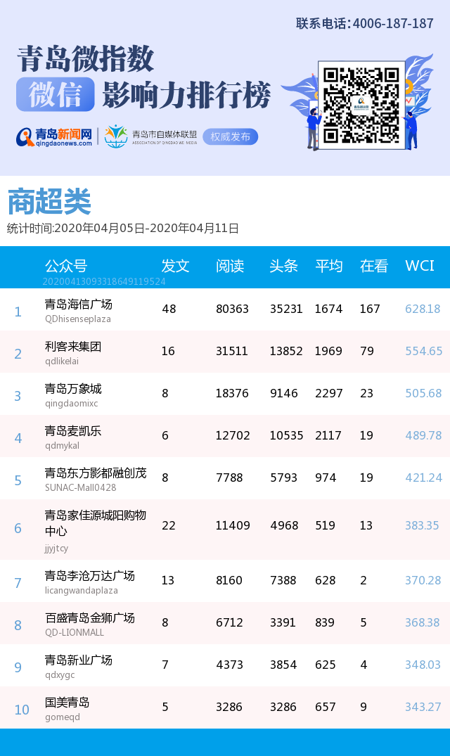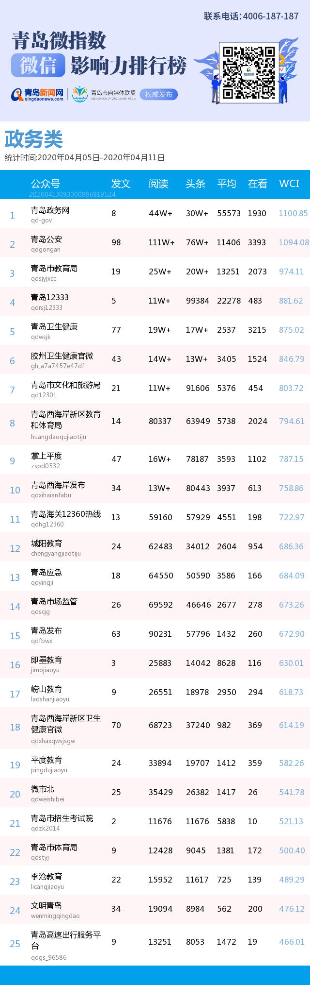 青島新聞網4月13日訊(記者 邢書玲)由青島新聞網打造的“青島微指數微信影響力排行榜”今日發布一周(2020年4月5日-2020年4月11日)榜單。
