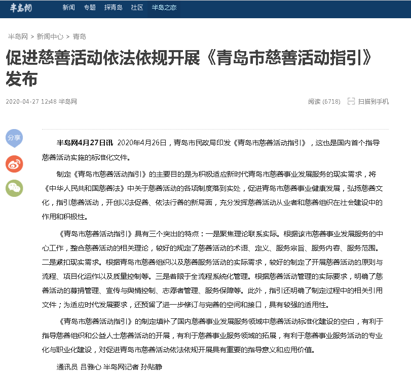 半島網(wǎng):促進(jìn)慈善活動(dòng)依法依規(guī)開(kāi)展《青島市慈善活動(dòng)指引》發(fā)布