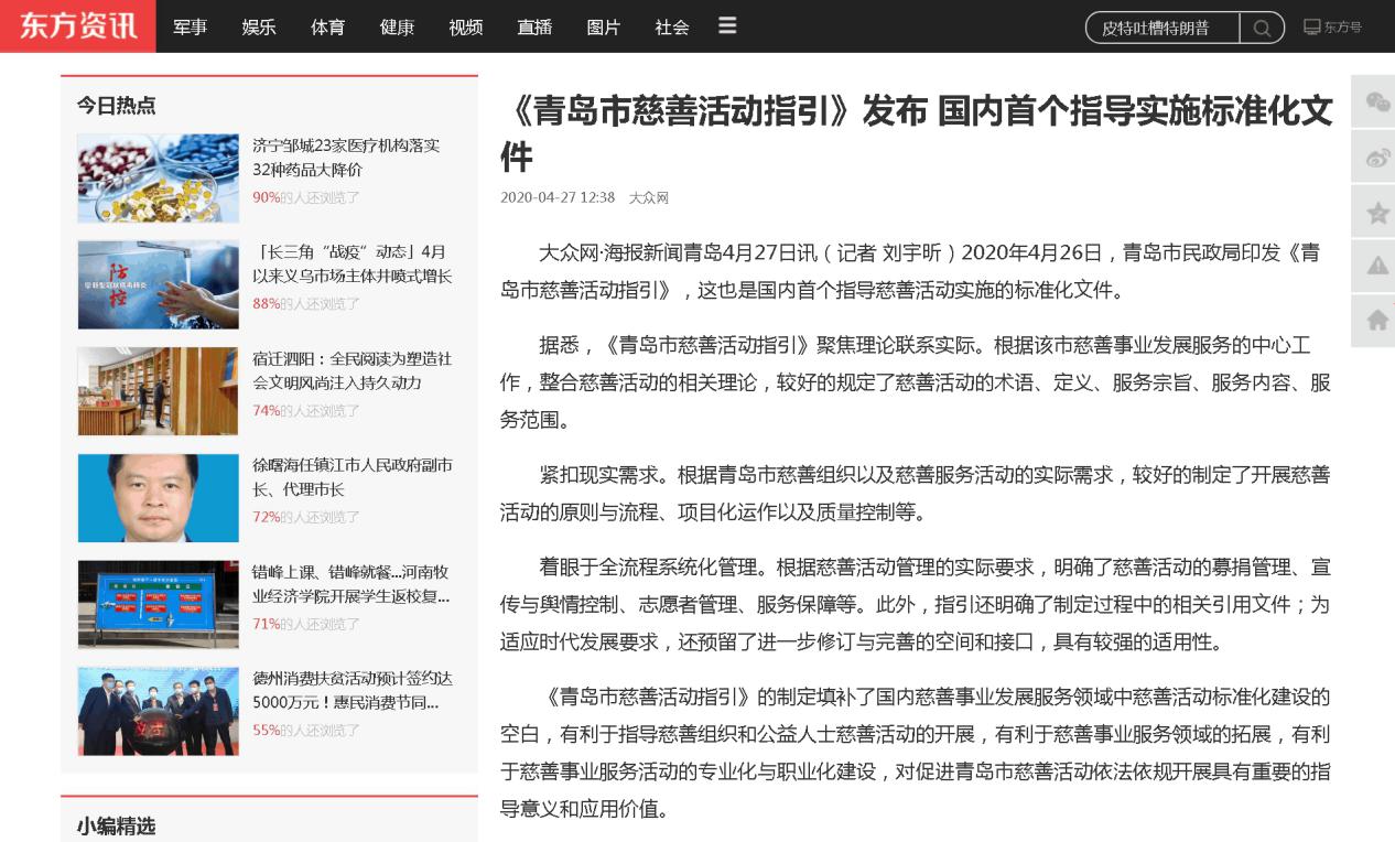 東方資訊:《青島市慈善活動(dòng)指引》發(fā)布國(guó)內(nèi)首個(gè)指導(dǎo)實(shí)施標(biāo)準(zhǔn)化文件