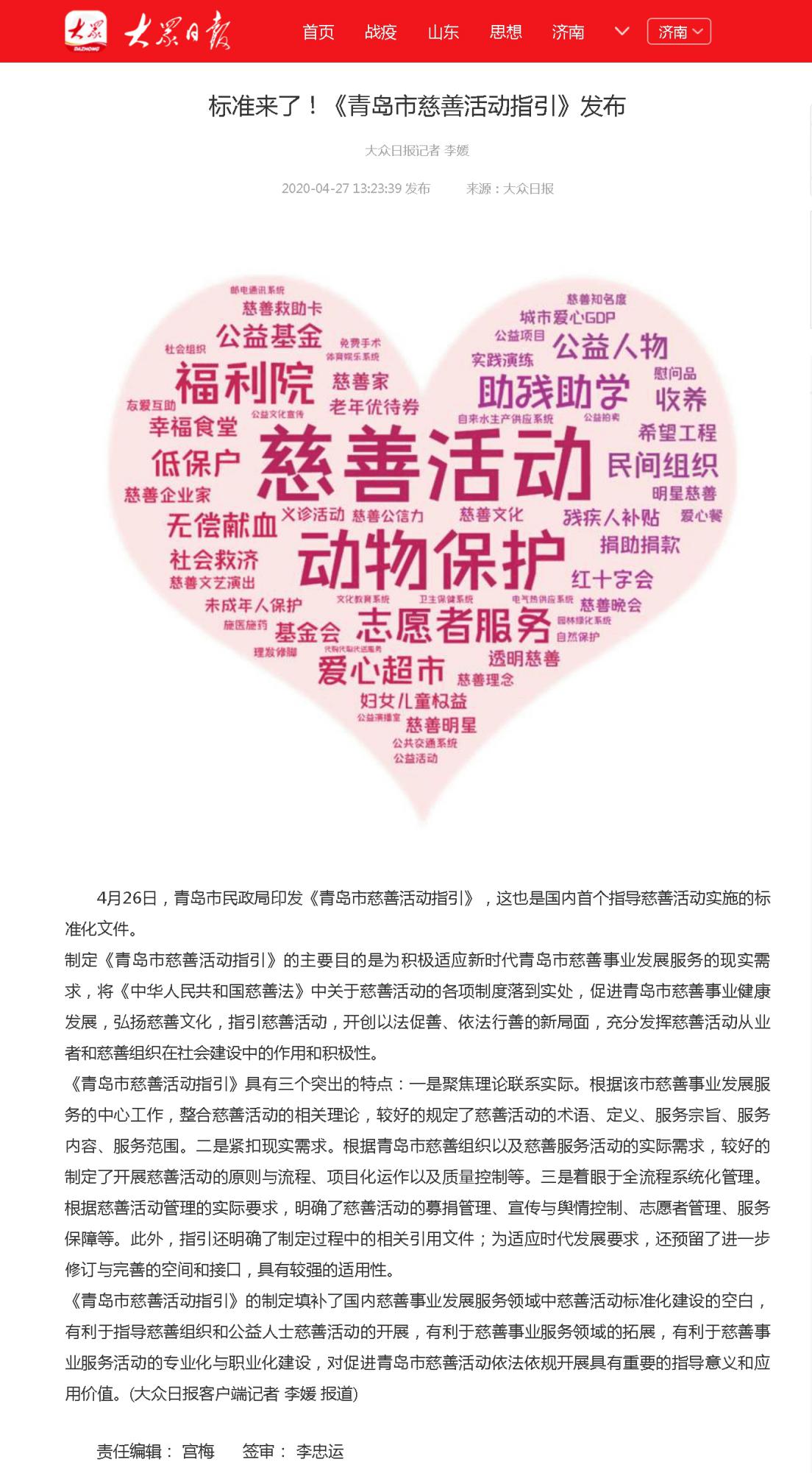 齊魯網(wǎng):青島發(fā)布國(guó)內(nèi)首個(gè)指導(dǎo)慈善活動(dòng)實(shí)施標(biāo)準(zhǔn)化文件