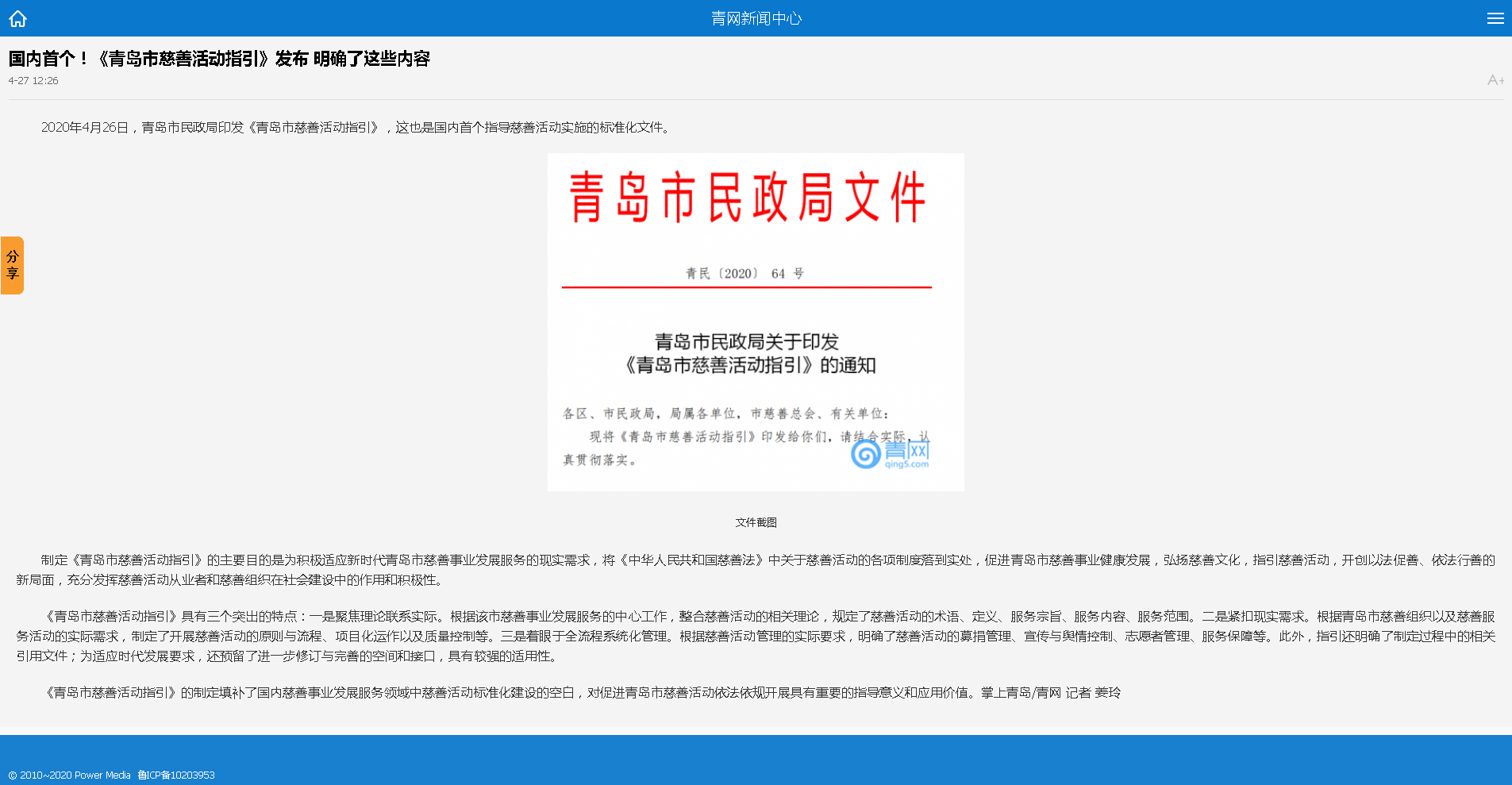 青島海外網(wǎng)(今日頭條):青島發(fā)布國(guó)內(nèi)首個(gè)指導(dǎo)慈善活動(dòng)實(shí)施標(biāo)準(zhǔn)化文件