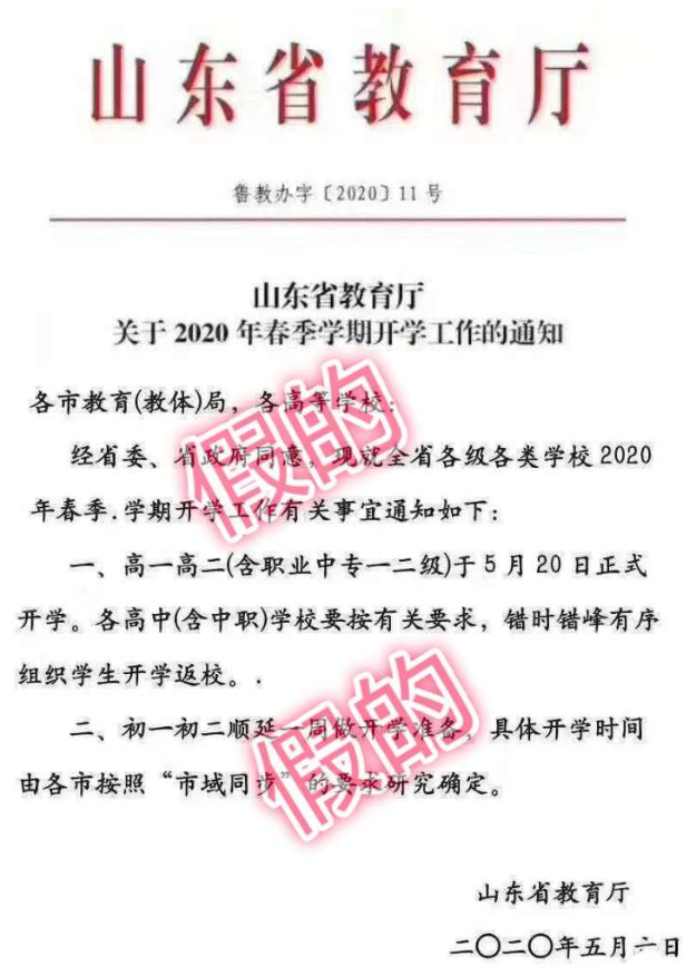 齊魯網(wǎng)·閃電新聞5月7日訊近日,網(wǎng)上一張截圖引起一些學(xué)生和家長關(guān)注。截圖顯示:山東省教育廳下發(fā)通知,經(jīng)省委、省政府同意,高一高二年級(jí)將于5月20日正式開學(xué)。很多盼望開學(xué)的學(xué)生家長,看到之后將信將疑。