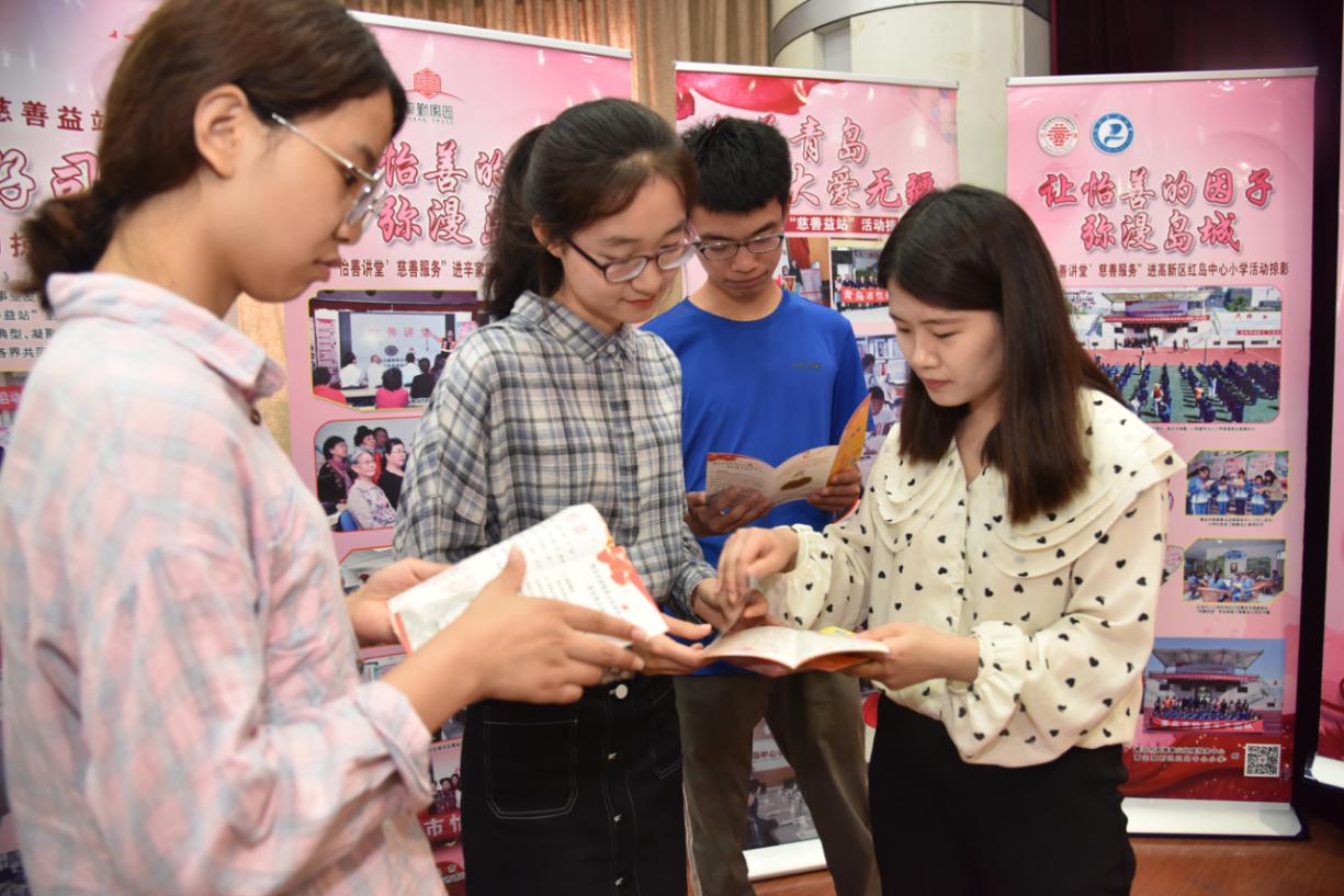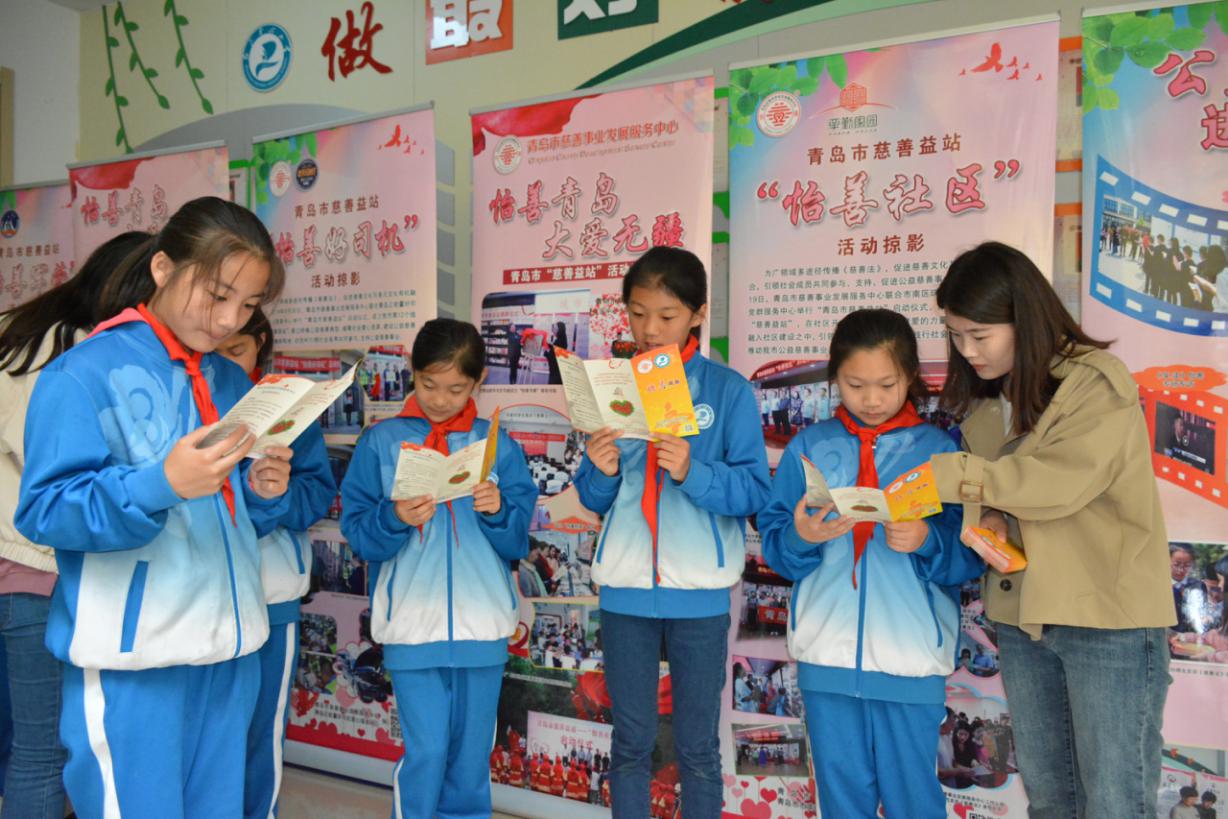 紅島中心小學(xué)的學(xué)生們?cè)谇鄭u市慈善益站“怡善悅讀”專區(qū)閱讀《慈善法》相關(guān)書籍
