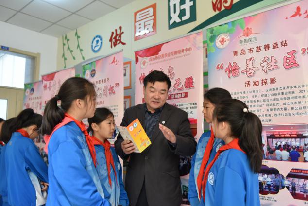 青島市慈善事業(yè)發(fā)展服務(wù)中心工作人員向小學(xué)生發(fā)放《慈善法》宣傳折頁(yè)
