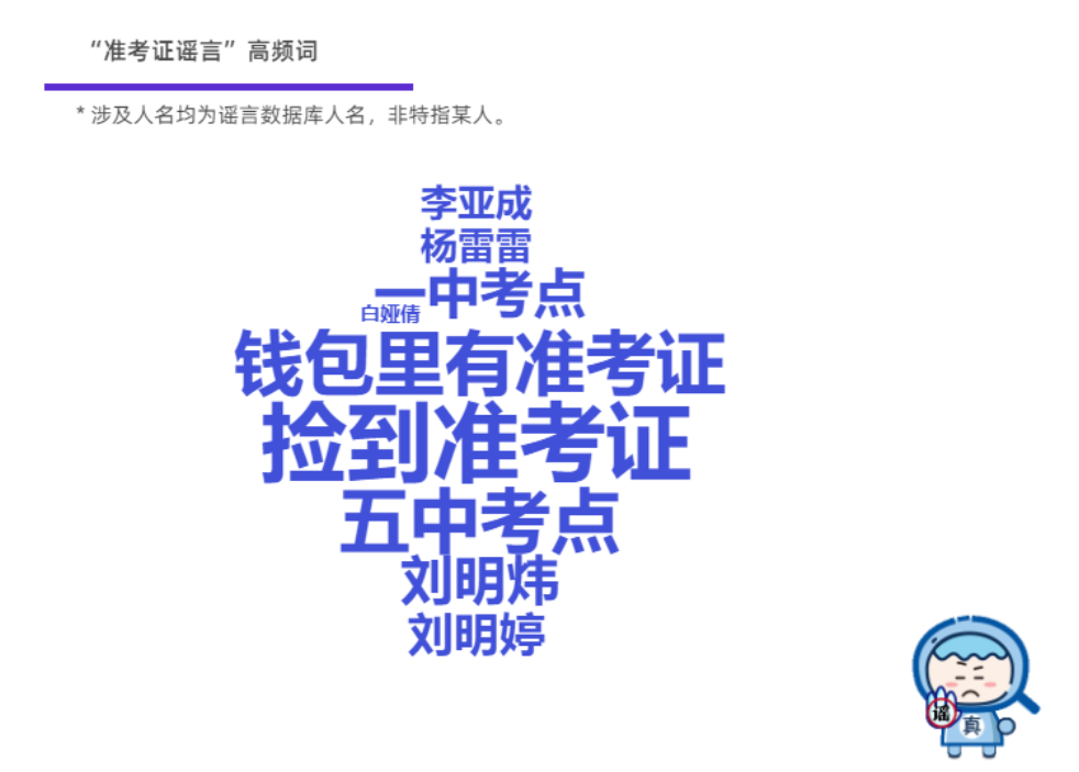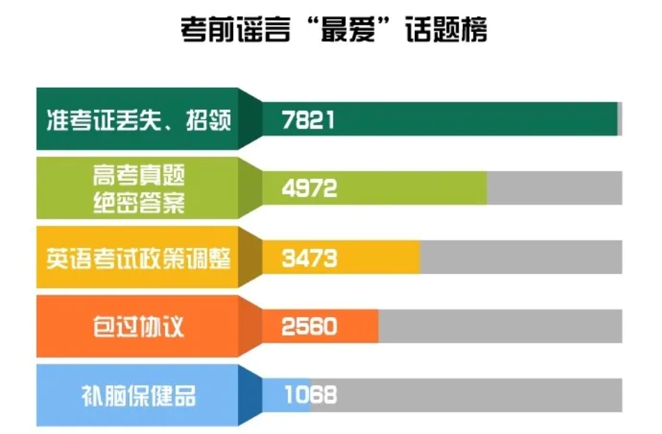 丟準考證事件每年都有發生,一方面讓信息真假難辨,迷惑性強,不少網民正出于善于轉發,給了謠言可乘之機;另一方面,其較高的出現頻率、舊謠新傳等特點,也為識謠辨謠提供了契機。中國互聯網聯合辟謠平臺對近3年此類謠言進行梳理,歸納出此類謠言高頻詞,看到它們,就別轉了!