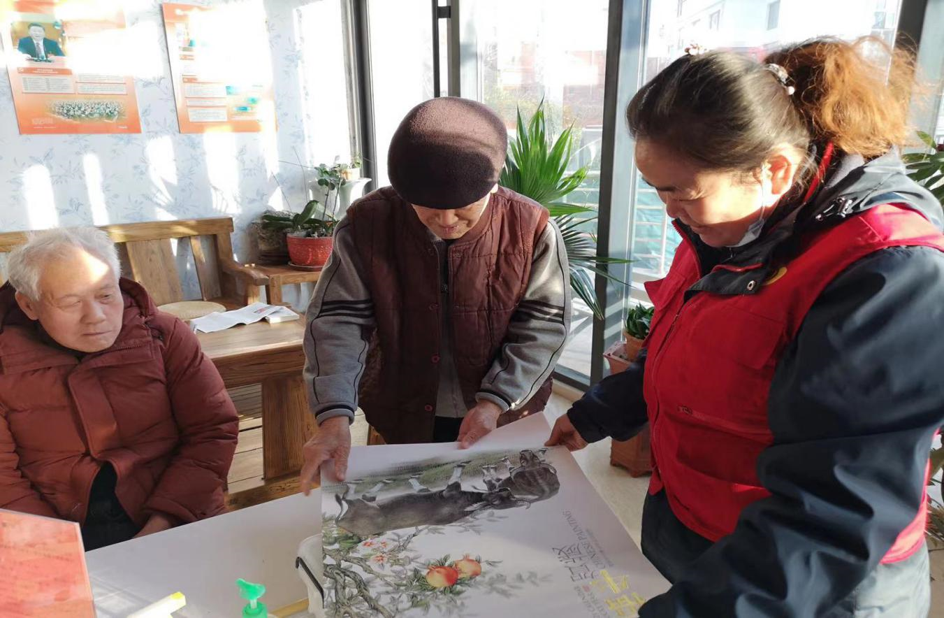 從三位老人家出來,志愿者們開車奔赴香港東路的“山水居”生態養老中心,探望那里的空巢老人們。受今年新冠疫情影響,每年為“山水居”的老人們慶賀集體生日的活動只能暫停。新的一年即將到來,疫情也得到了很好管控。志愿者們三九嚴寒天為老人們送禮物來了,防疫用的酒精消毒濕巾,洗漱用品毛巾和香皂,一并送上的還有新年掛歷。老人們迫不及待的打開掛歷欣賞,表達感激之情。志愿者孟珂為養老中心的老人們贈送了一份全年報卡,放在讀報角方便更多的老人閱讀觀看。