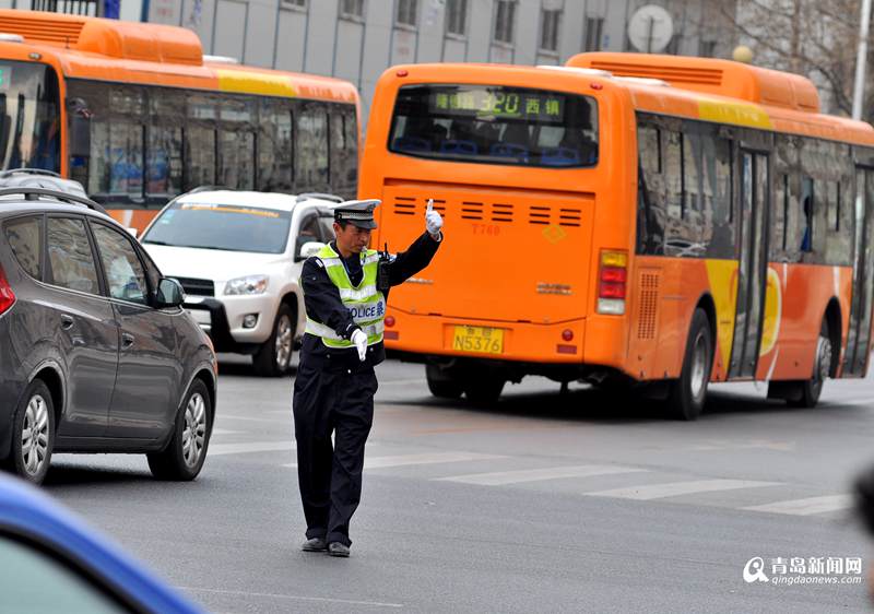 4月19日上午8時(shí)許,記者在山東路與延吉路路口看到,站在馬路中央的李涌正在忙著指揮交通,正值上班早高峰,車(chē)流量相當(dāng)大。李涌先是朝面向自己的司機(jī),雙手向胸前收,示意司機(jī)向馬路中央處行駛,有一些司機(jī)明白了這個(gè)手勢(shì)的含義后,緩緩地開(kāi)車(chē)到了李涌跟前,李涌隨后又做了一個(gè)停車(chē)手勢(shì),示意司機(jī)先停車(chē)等候,司機(jī)停車(chē)后,李涌面帶微笑地豎起了大拇指。記者看到,一些司機(jī)看到交警對(duì)自己豎起了大拇指,很多人要么是點(diǎn)頭致謝,要么也是致以微笑,有人也豎起了大拇指。