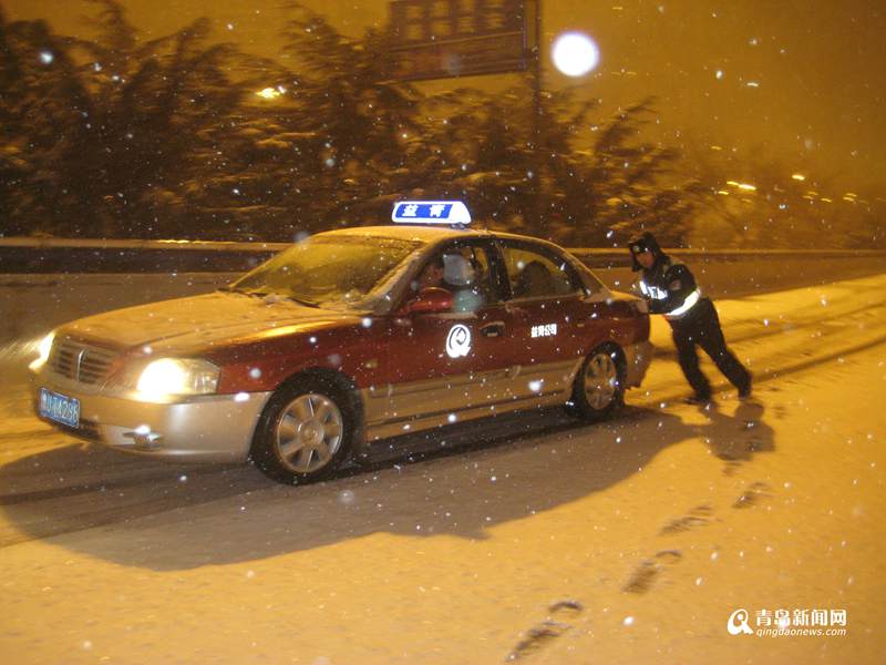 每年下大雪時(shí),李涌都會(huì)出現(xiàn)在膠寧高架路的上坡路段,發(fā)動(dòng)駕駛員相互推車自救。有時(shí),他甚至把自己的身軀趴車頭上,用增加車前部重量的方法,避免輪胎打滑,一輛一輛地,引導(dǎo)近百輛車順利通過。