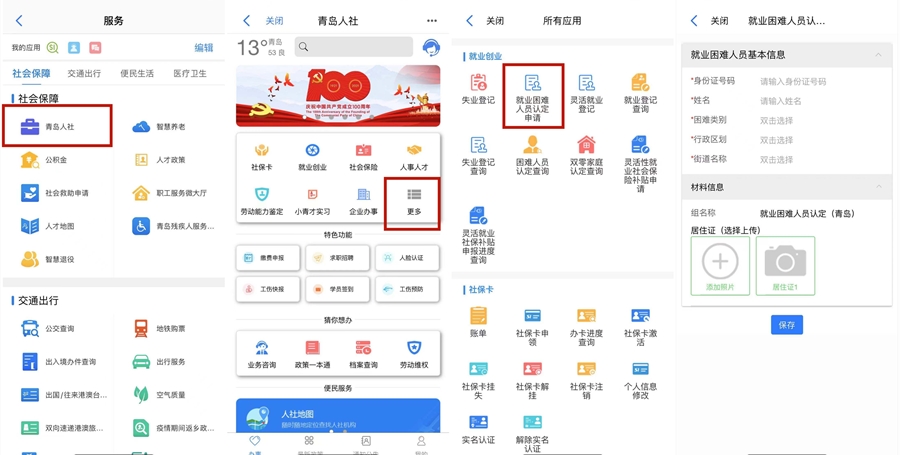 符合上述條件的人員除可登錄市人社局官網線上申請,也可向任一街道(鎮)人力資源和社會保障服務中心提出就業困難人員認定申請。現在,就業困難人員可登錄“愛山東·青e辦”APP,簡單操作兩步,實現掌上認定申請。首先,在“愛山東?青e辦”APP首頁頂端搜索欄搜索“青島人社”服務或點擊首頁更多-社會保障-青島人社;然后,在應用詳情頁點擊更多找到“就業創業”模塊,點擊“就業困難人員認定申請”進入詳情頁后根據要求填寫信息后提交申請即可。申請提交后,如需查看審核結果,可點擊“困難人員認定查詢”進行查看。