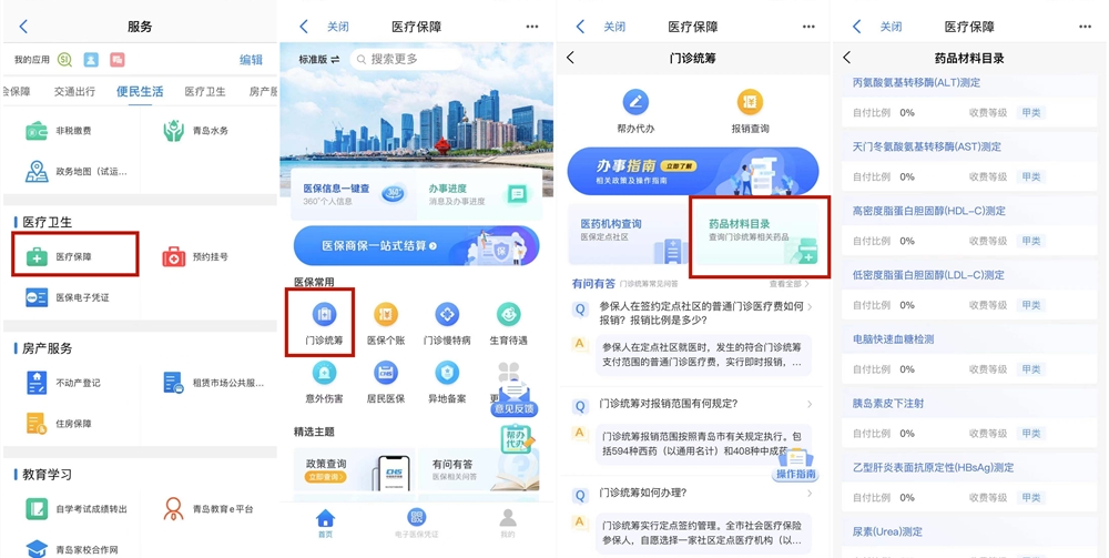 “愛山東·青e辦”內(nèi)的“醫(yī)療保障”應(yīng)用,可掌上查詢最新的國家藥品目錄,且查詢步驟簡單。首先,在“愛山東·青e辦”APP首頁點(diǎn)擊“更多”,進(jìn)入“服務(wù)”詳情頁找到醫(yī)療衛(wèi)生分類下的“醫(yī)療保障”應(yīng)用;然后,在應(yīng)用詳情頁的“醫(yī)保常用”模塊下找到“門診統(tǒng)籌”點(diǎn)擊進(jìn)入;最后,在“門診統(tǒng)籌”頁面點(diǎn)擊“藥品材料目錄”即可查詢藥品目錄清單、自付比例、收費(fèi)等級等藥品報銷信息。