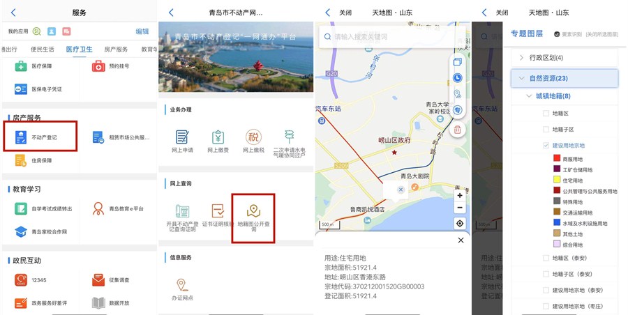 有需要的企業(yè)群眾只需三步,即可實(shí)現(xiàn)掌上查詢。首先,在“愛(ài)山東·青e辦”APP首頁(yè)點(diǎn)擊“更多”進(jìn)入“服務(wù)”詳情頁(yè),找到“房產(chǎn)服務(wù)”分類,點(diǎn)擊“不動(dòng)產(chǎn)登記”。第二步,進(jìn)入不動(dòng)產(chǎn)登記網(wǎng)上辦事大廳后,在“網(wǎng)上查詢”模塊下,找到“地籍圖公開(kāi)查詢”,點(diǎn)擊進(jìn)入即可查詢,地籍圖的查詢、復(fù)制不收取任何費(fèi)用。