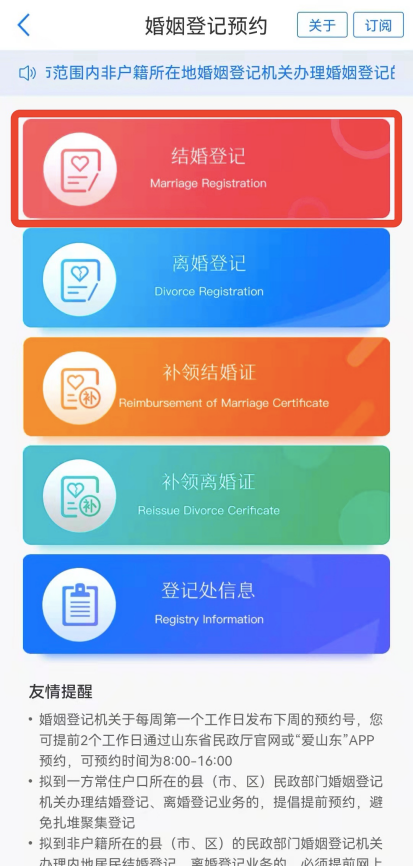 為避免扎堆聚集、長時間排隊等候,引導大家錯峰登記,“愛山東”移動政務服務平臺提供了掌上結婚登記預約服務,讓準新人們足不出戶就可進行結婚登記預約,更快地拿到“愛的號碼牌”。準新人們一起來看看吧!