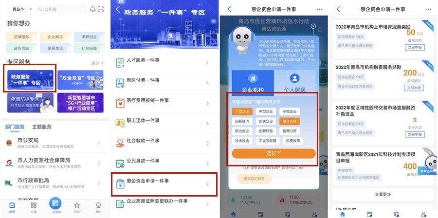 青島新聞網2月24日訊 按照全市智慧城市建設工作部署,市民營經濟局、市財政局依托“青島政策通”平臺推動“惠企資金申請”一件事,平臺集在線申報、在線審批、結果公示、資金兌現、流程監管等功能于一體,全面實現了財政惠企資金兌現的全流程服務。為方便企業申請,“愛山東?青e辦”APP政務服務“一件事”專區上線了“惠企資金申請”一件事,實現了惠企資金申請“掌上辦”“指尖辦”。
