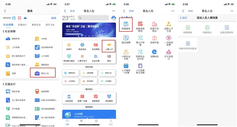 除市人社局官網外,為方便市民辦事,“愛山東·青e辦”也提供了檔案業務掌上辦理渠道。有需要的市民只需三步即可完成掌上辦理。首先,在“愛山東·青e辦”APP“服務”詳情頁找到社會保障分類下的“青島人社”應用;然后,在應用詳情頁的“人事人才”欄目下,找到“檔案服務”模塊,點擊進入詳情頁后根據實際需求可選擇辦理檔案轉出、檔案接收、出具證明材料、檔案所在機構查詢等業務。根據每項業務頁面要求填寫、提交相關材料,點擊提交,閱讀注意事項后,點擊確認即可完成在線申請。