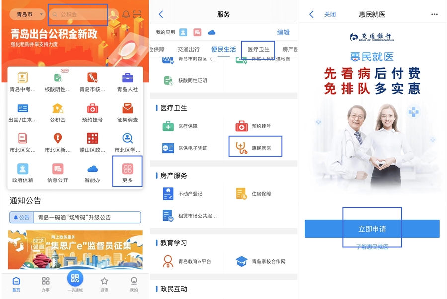 為解決就醫便利問題,愛山東·青e辦對接上線了交通銀行開發的惠民就醫便民服務。據悉,該產品讓患者不用先行支付醫療費用,真正做到先診療后結算的“醫后付”模式,解決患者面臨治療時“資金難”的問題。
