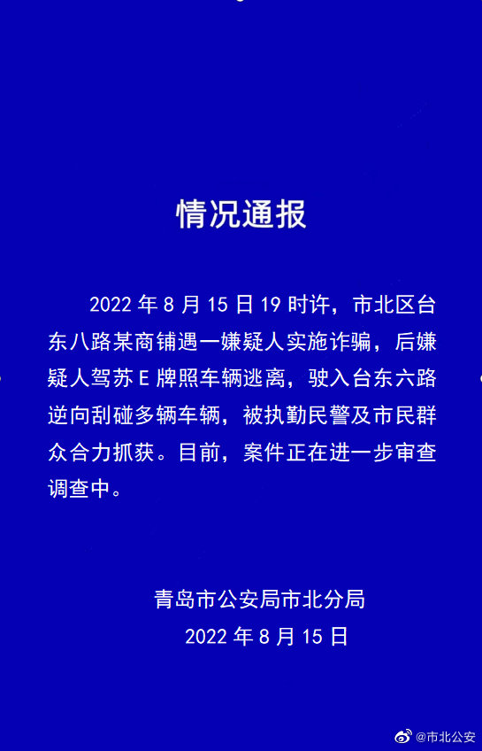 山東青島市北分局通報(bào):8月15日19時(shí)許,某商鋪遇一嫌疑人實(shí)施詐騙。后嫌疑人駕車(chē)逃離逆向刮碰多車(chē),被執(zhí)勤民警及市民群眾合力抓獲。目前,案件正在進(jìn)一步審查調(diào)查中。