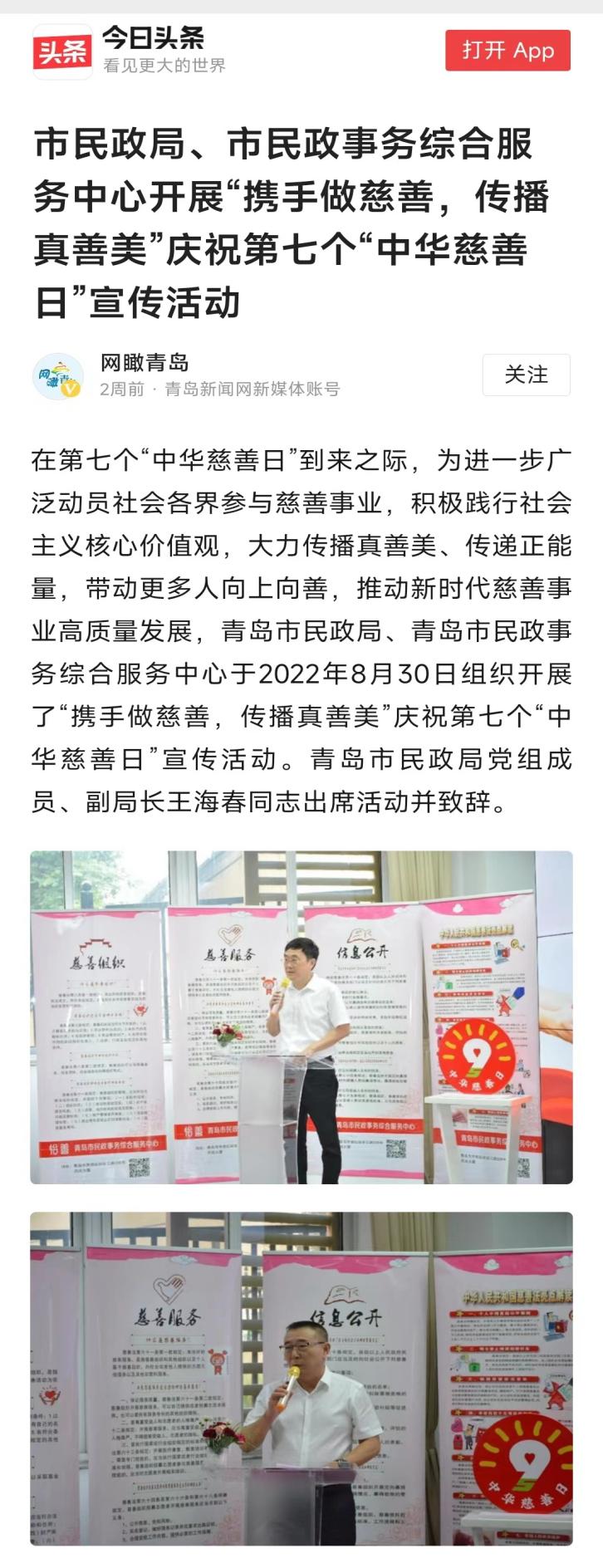 網(wǎng)瞰青島(頭條號(hào))2022-8-30:市民政局、市民政事務(wù)綜合服務(wù)中心開展慶祝第七個(gè)“中華慈善日”宣傳活動(dòng)